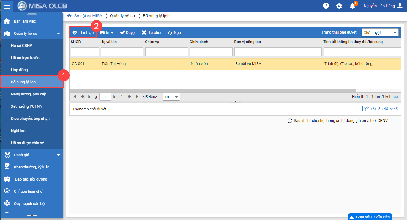 - Đăng nhập vào phần mềm với vai trò quản lý cán bộ, vào Quản lý hồ sơ\Bổ sung lý lịch, chọn Thiết lập.