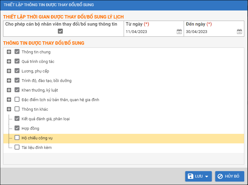 - Tích chọn Cho phép cán bộ nhân viên thay đổi/bổ sung thông tin hoặc bỏ tích chọn nếu chỉ CBTC có quyền thay đổi thông tin.