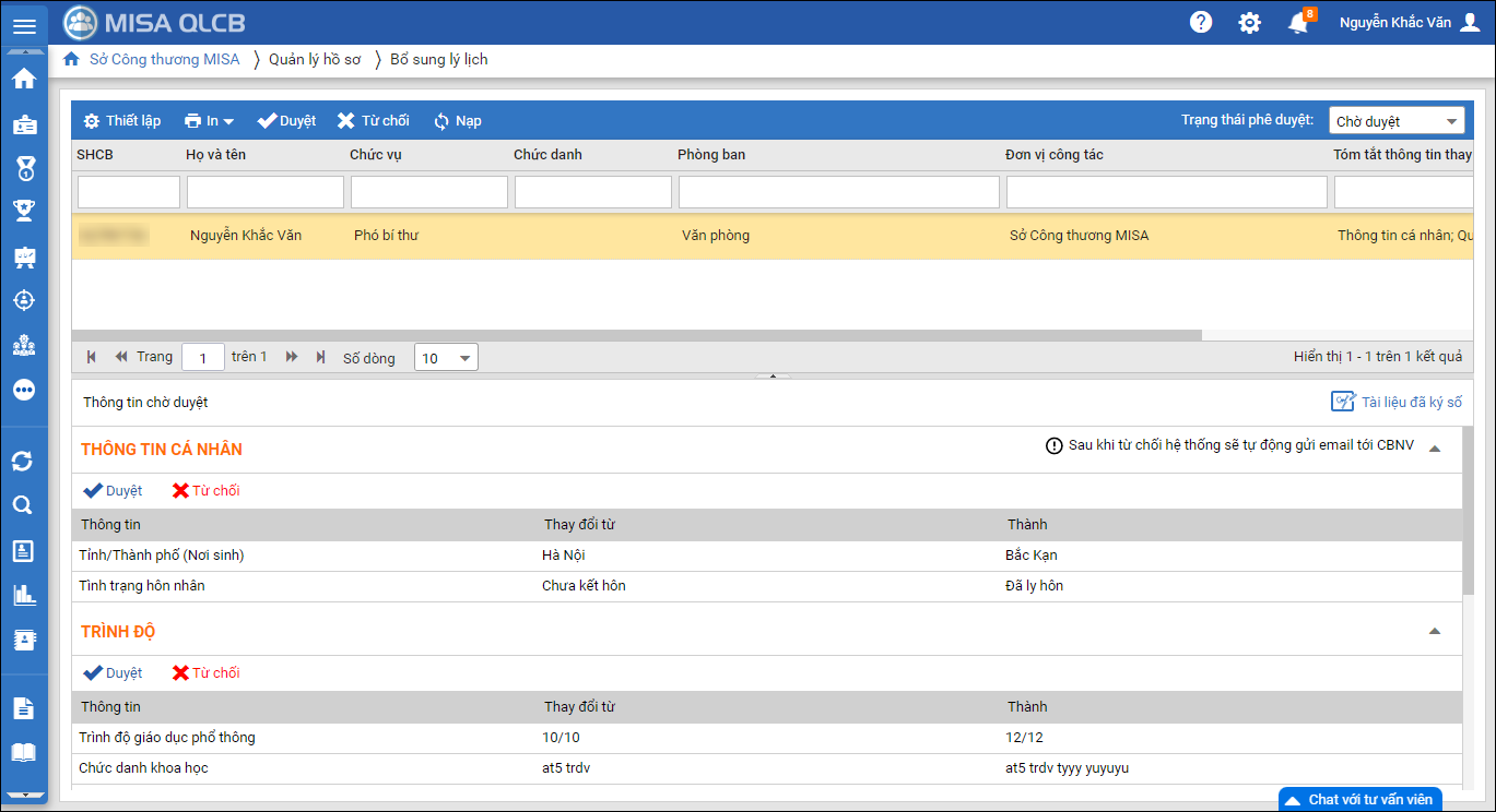 - Hồ sơ CBNV đã cập nhật sẽ được hiển thị ở trạng thái Chờ phê duyệt. CBTC kiểm tra từng mục thông tin đã thay đổi để phê duyệt hoặc từ chối phê duyệt hồ sơ.