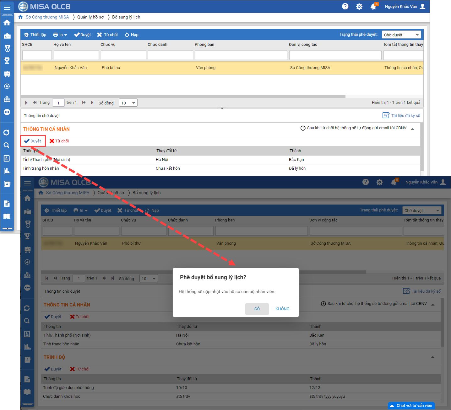 Nếu thông tin thay đổi chính xác, đạt điều kiện, nhấn Duyệt và xác nhận cập nhật thông tin vào hồ sơ CBNV.