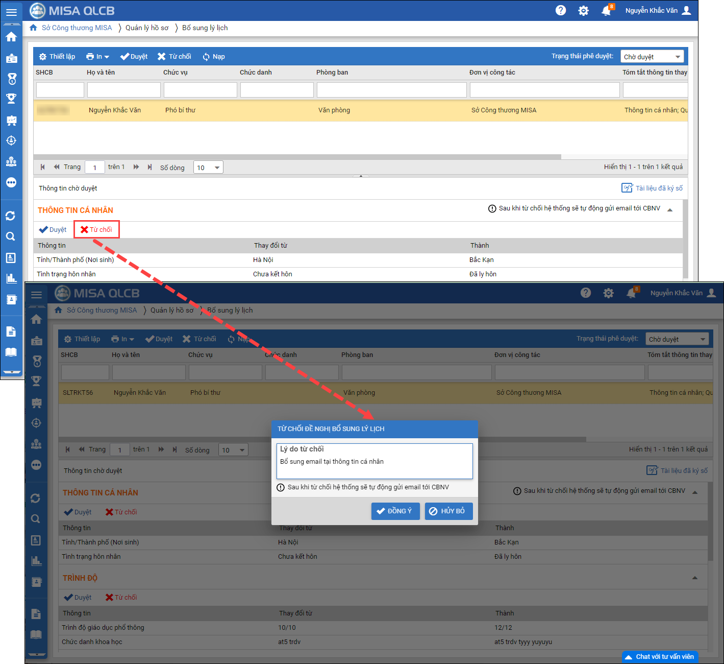 - Nếu từ chối phê duyệt thông tin, chọn Từ chối. Nhập Lý do từ chối, nhấn Đồng ý để gửi thông báo đến email của CBNV.