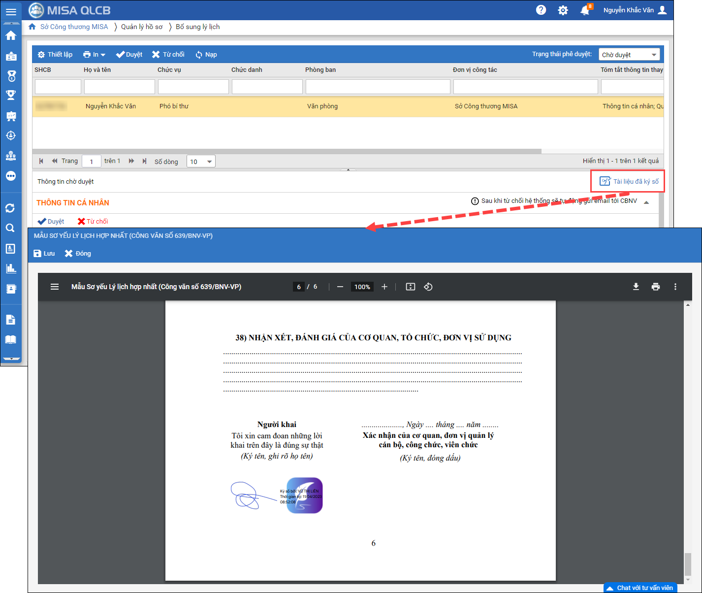 - CBTC có thể xem lại chi tiết tài liệu CBNV đã ký số.