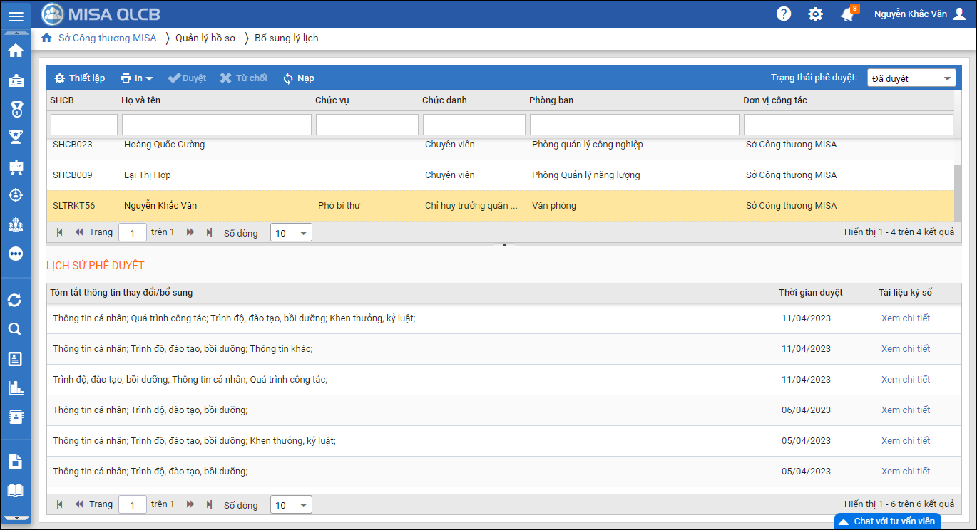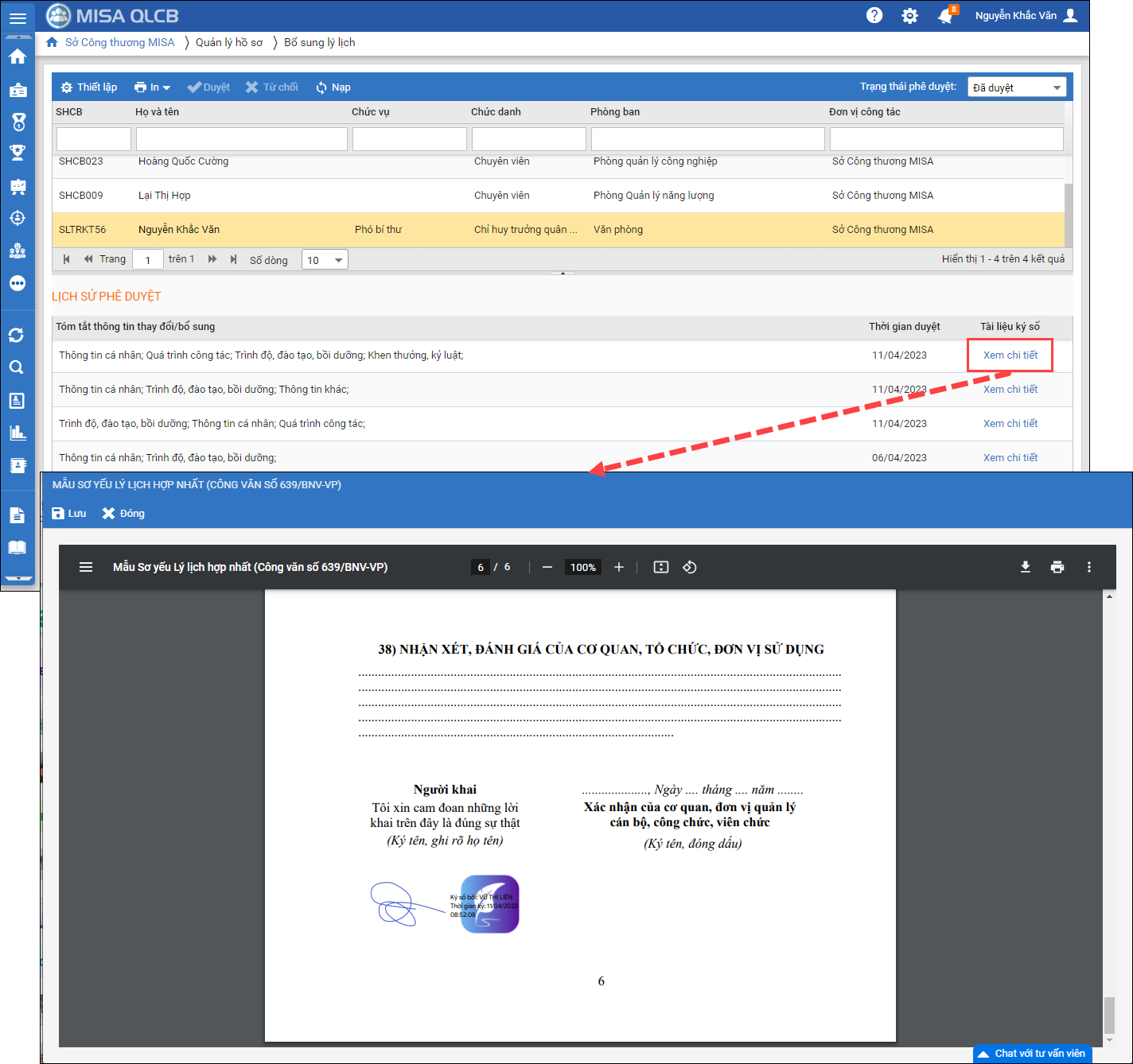 - Tại đây, CBTC có thể theo dõi lịch sử các lần phê duyệt hồ sơ CBNV.