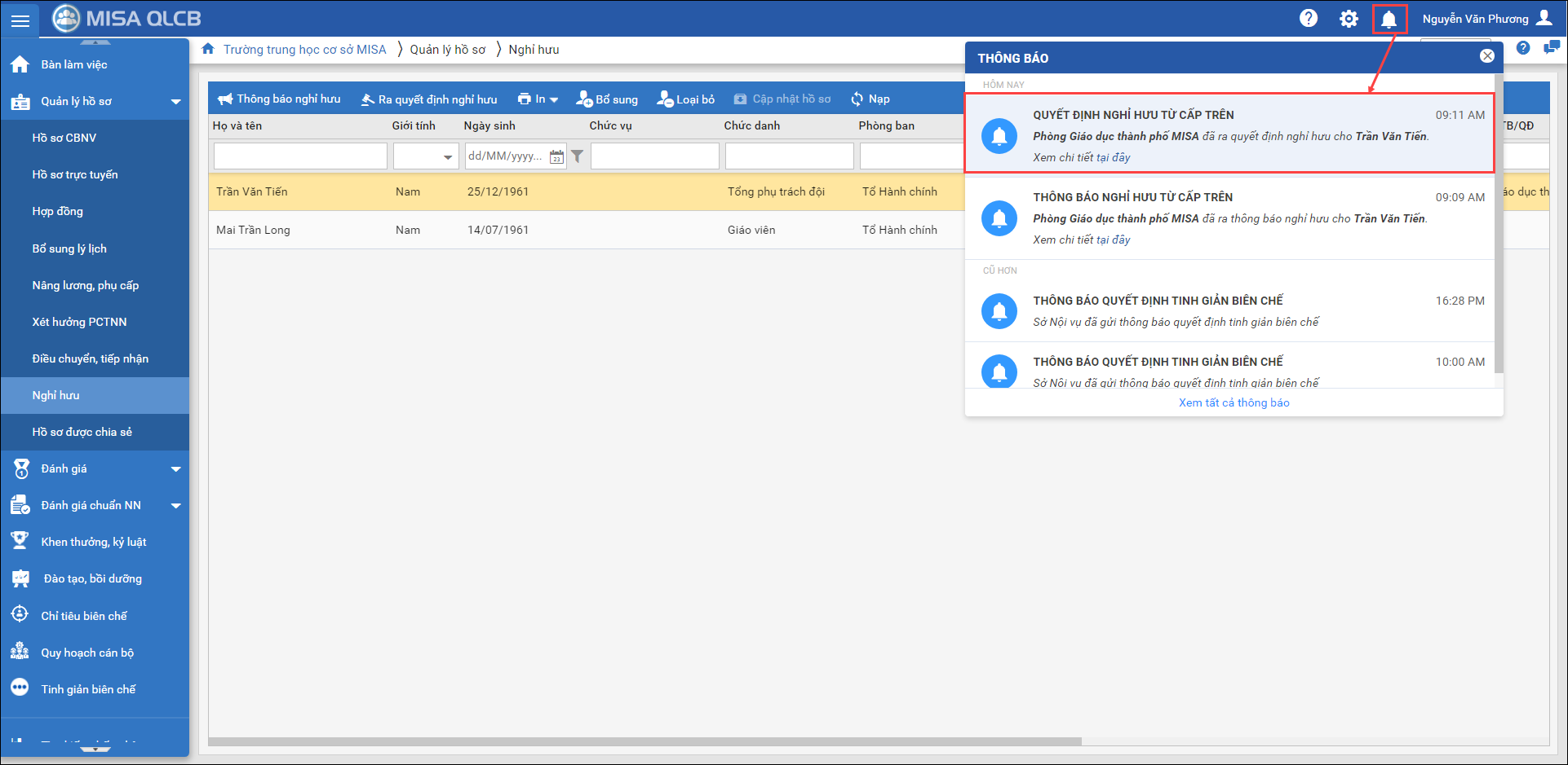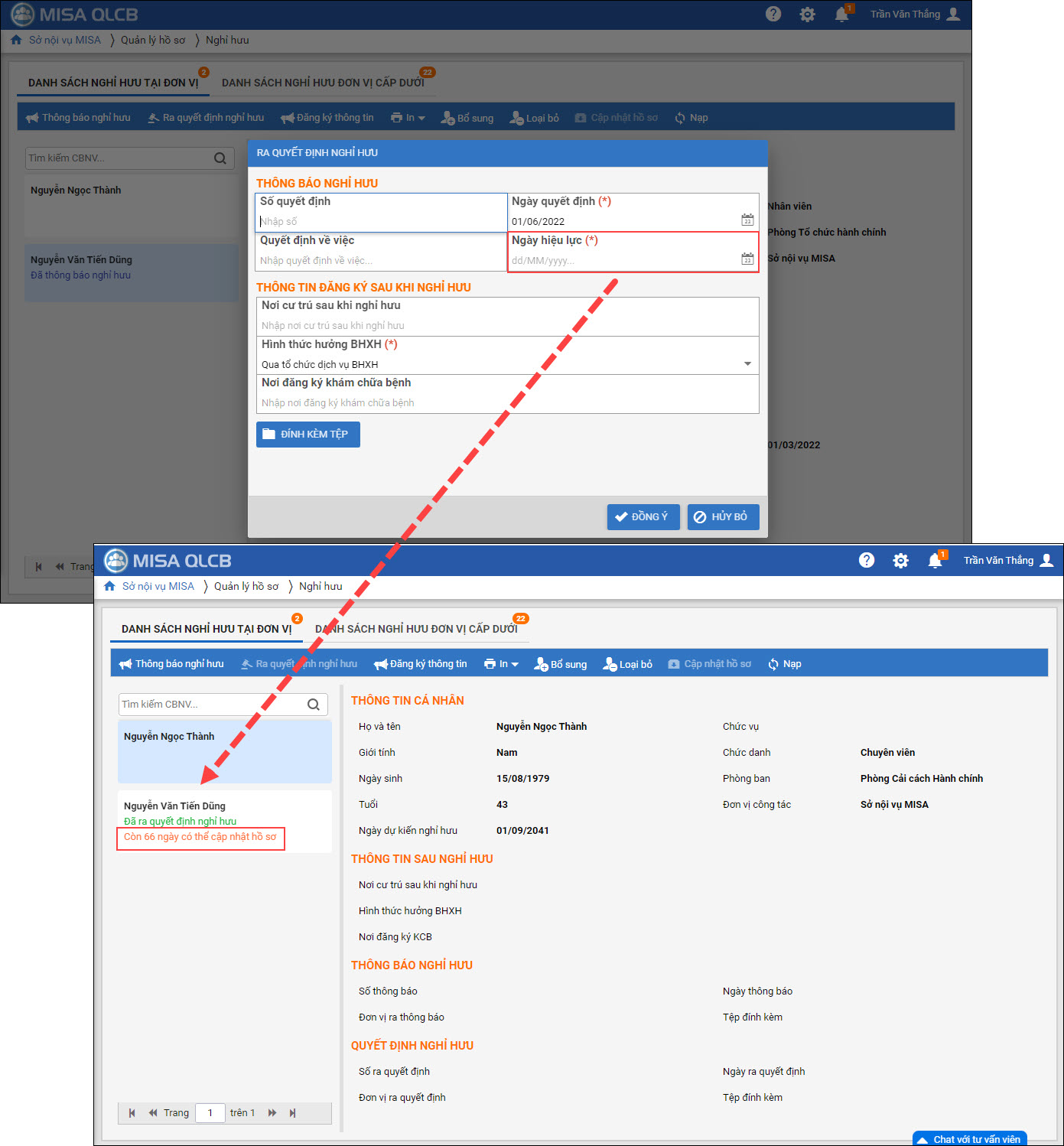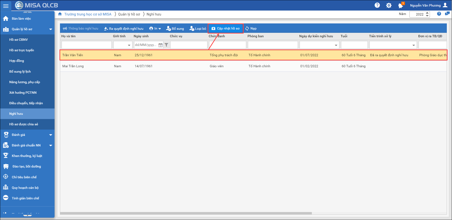 2. Nhấn Cập nhật nhật hồ sơ để cập nhật quyết định nghỉ hưu chính thức vào hồ sơ của CBNV.