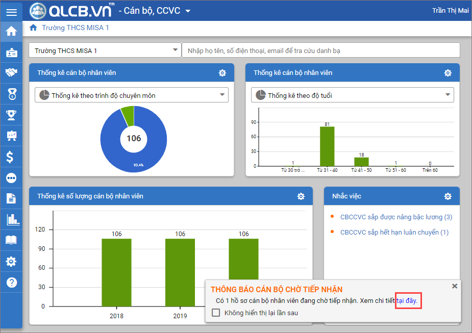 5. Nhấn Đồng ý. Hệ thống hiển thị thông báo đã tiếp nhận cán bộ nhân viên.