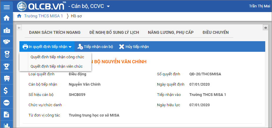 3. Nếu tiếp nhận cán bộ đó thì nhấn Tiếp nhận cán bộ.