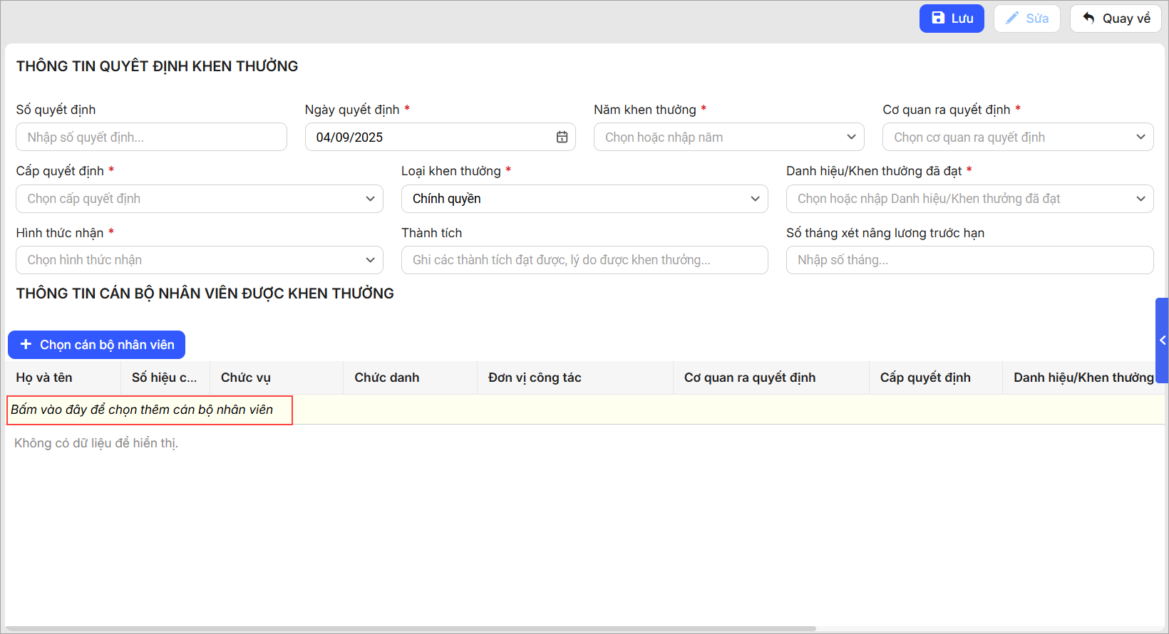 4. Nhấn Lưu để thêm quyết định khen thưởng.