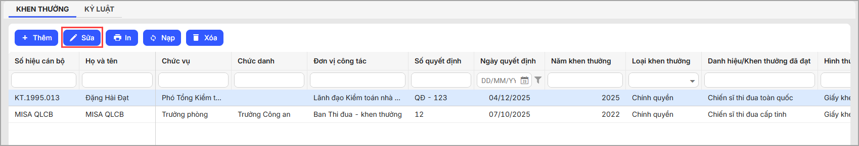 • Số quyết định: Nhập số quyết định khen thưởng có trên quyết định