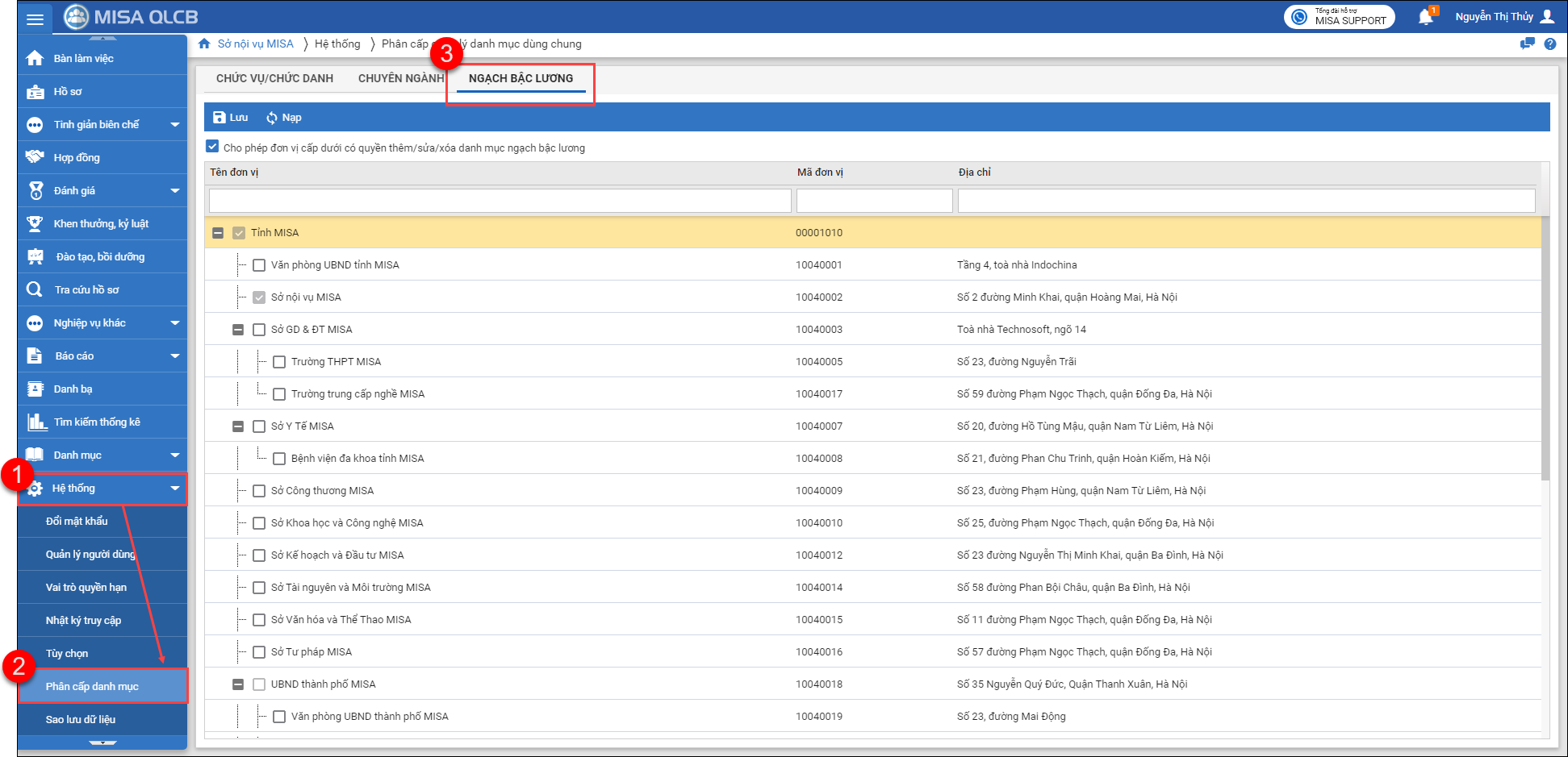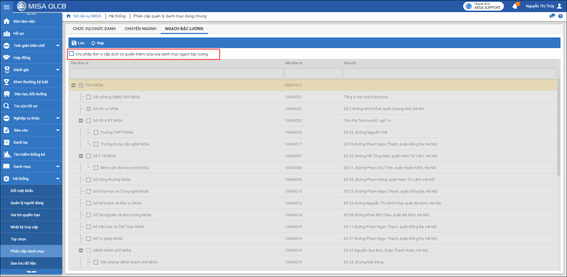 3. Ngoài ra, khi bỏ tích chọn Cho phép đơn vị cấp dưới có quyền thêm/sửa/xóa danh mục ngạch bậc lương, tất cả các đơn vị cấp dưới sẽ không có quyền thêm sửa xóa danh mục ngạch bậc lương. Nhấn Lưu.