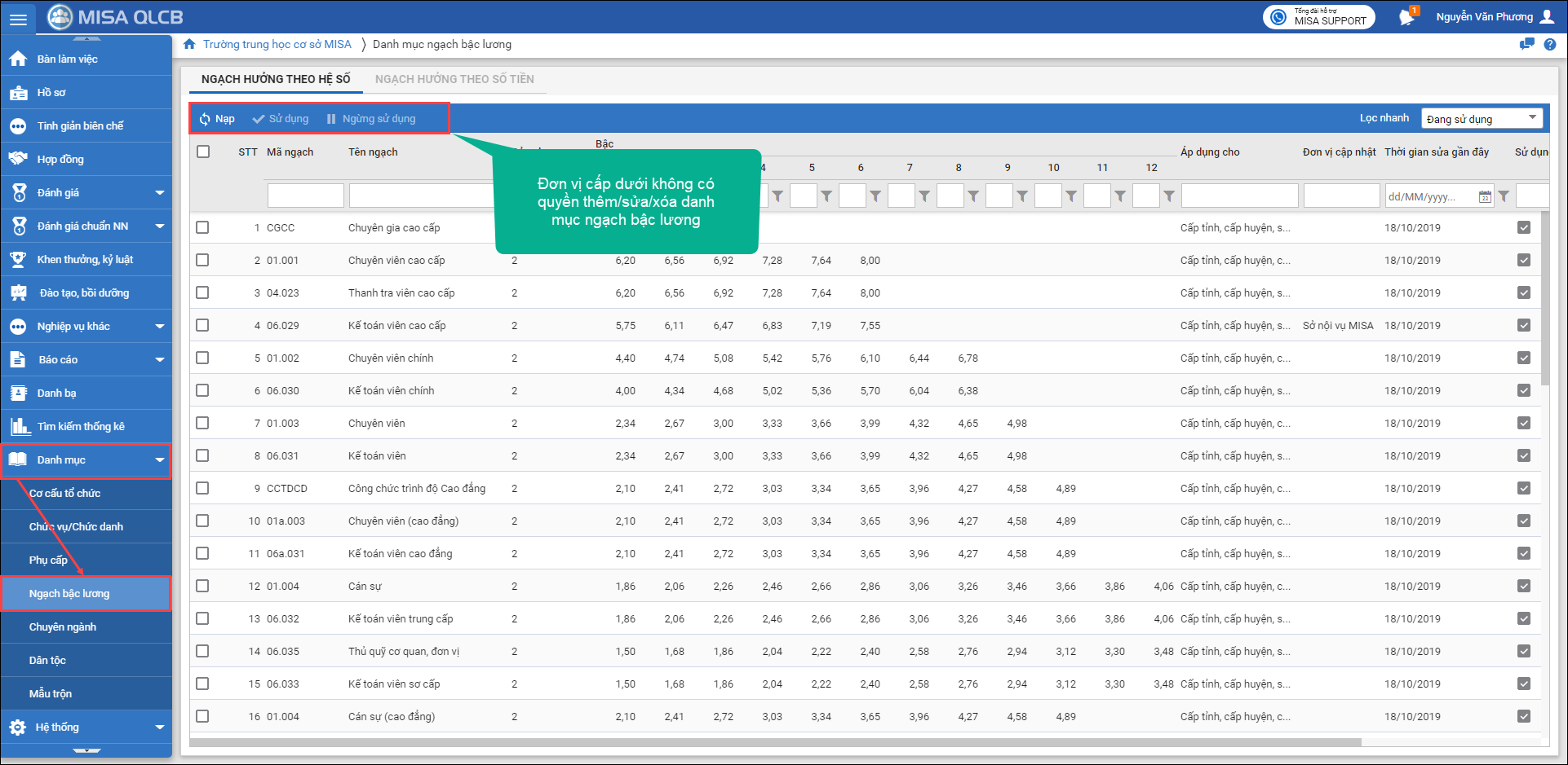 4. Khi đó tại đơn vị cấp dưới, khi vào menu Danh mục\Ngạch bậc lương, đơn vị cấp dưới sẽ chỉ có quyền tích chọn Sử dụng/Ngừng sử dụng chứ không có quyền thêm sửa xóa danh mục ngạch bậc lương nữa.