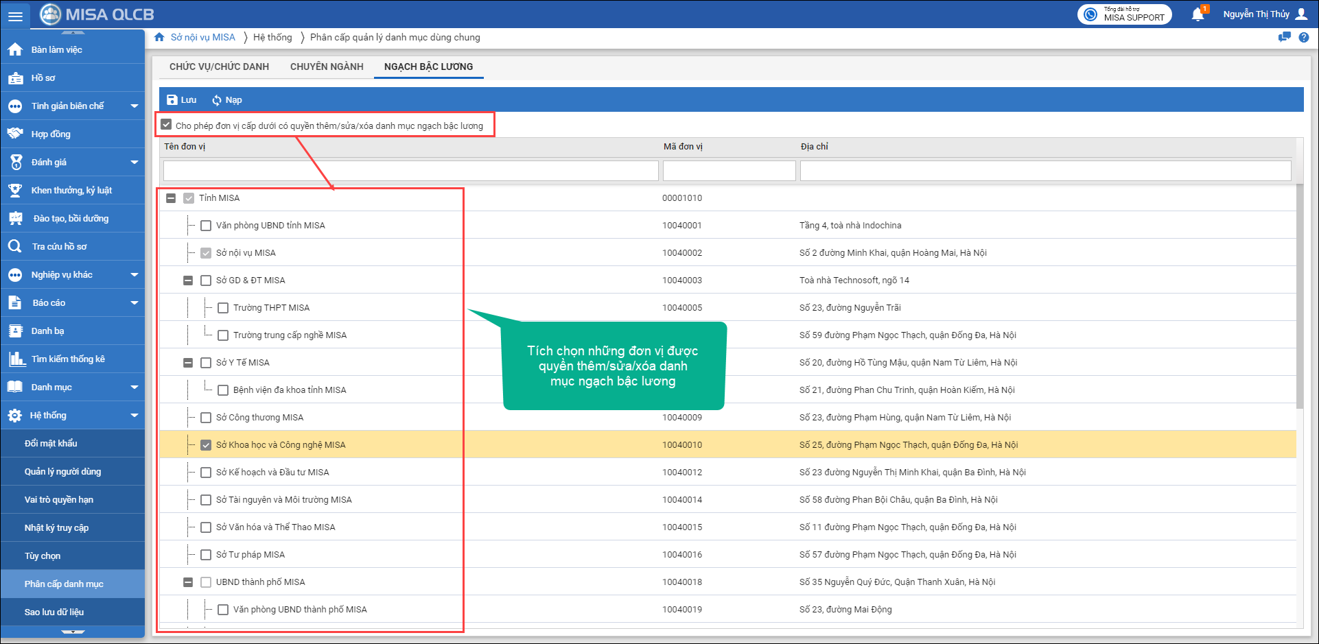 2. Để phân cấp sử dụng danh mục ngạch bậc lương, đơn vị chủ quản có thể tích chọn Cho phép đơn vị cấp dưới có quyền thêm/sửa/xóa danh mục ngạch bậc lương, khi đó có thể tích chọn những đơn vị có quyền thêm sửa xóa danh mục ngạch bậc lương.
