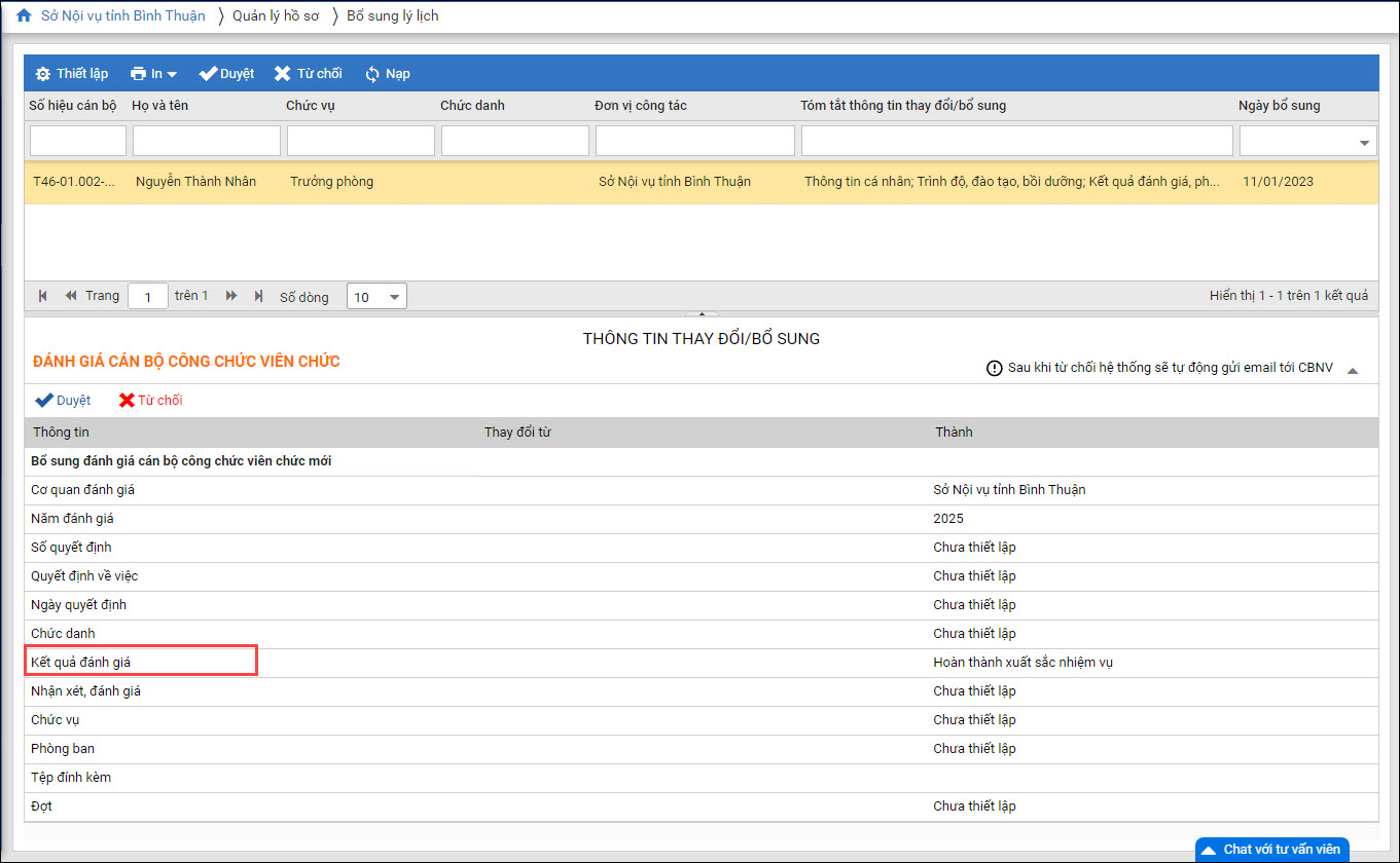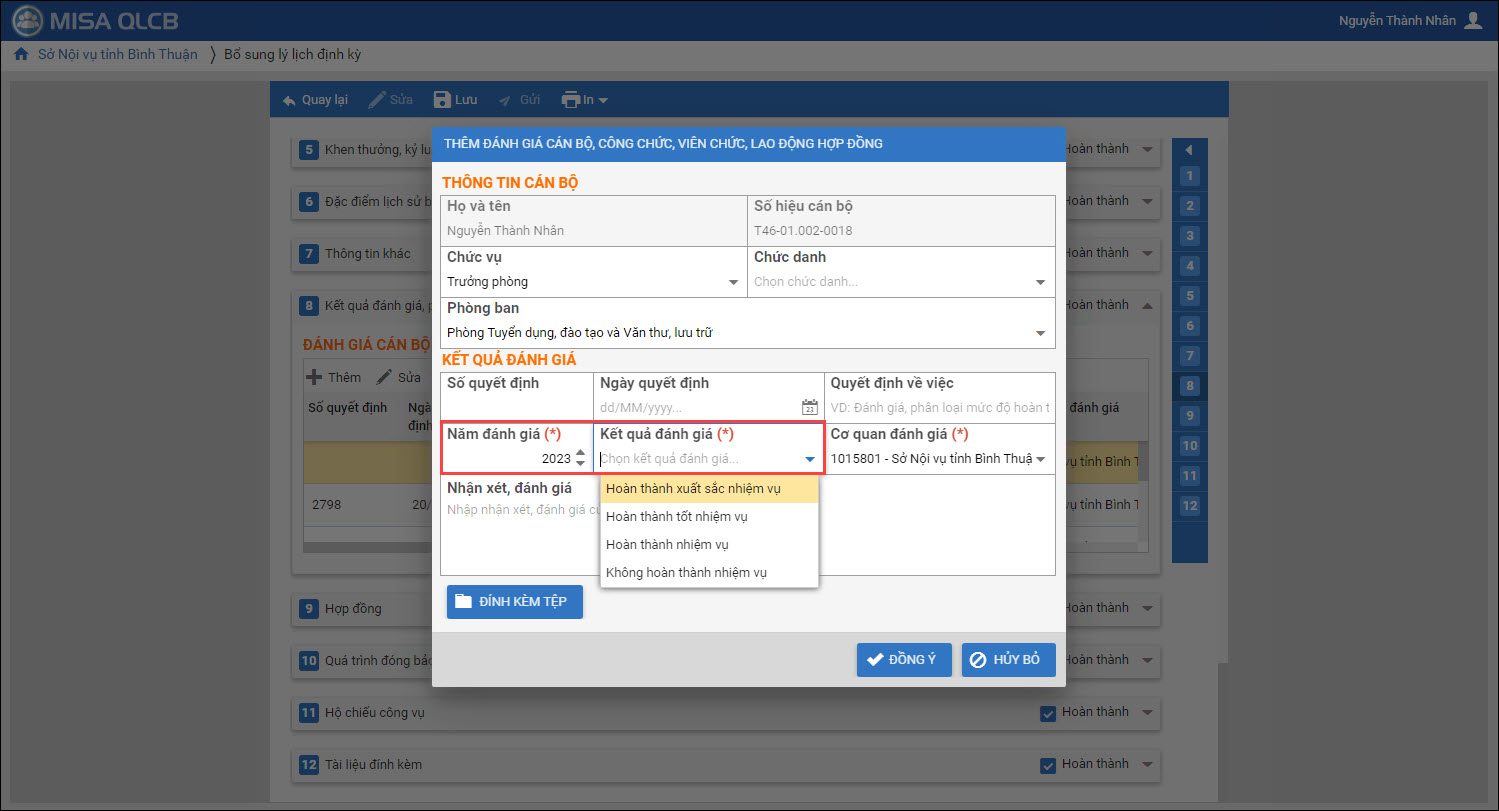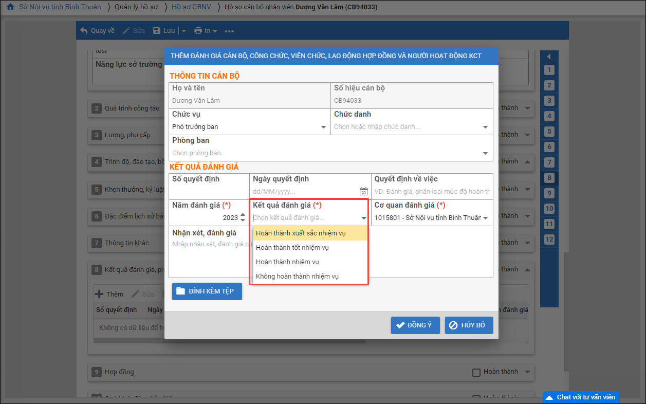 - Tại Quản lý hồ sơ\Hồ sơ CBNV\Kết quả đánh giá, phân loại: Cập nhật quy các giá trị các mục Kết quả đánh giá.