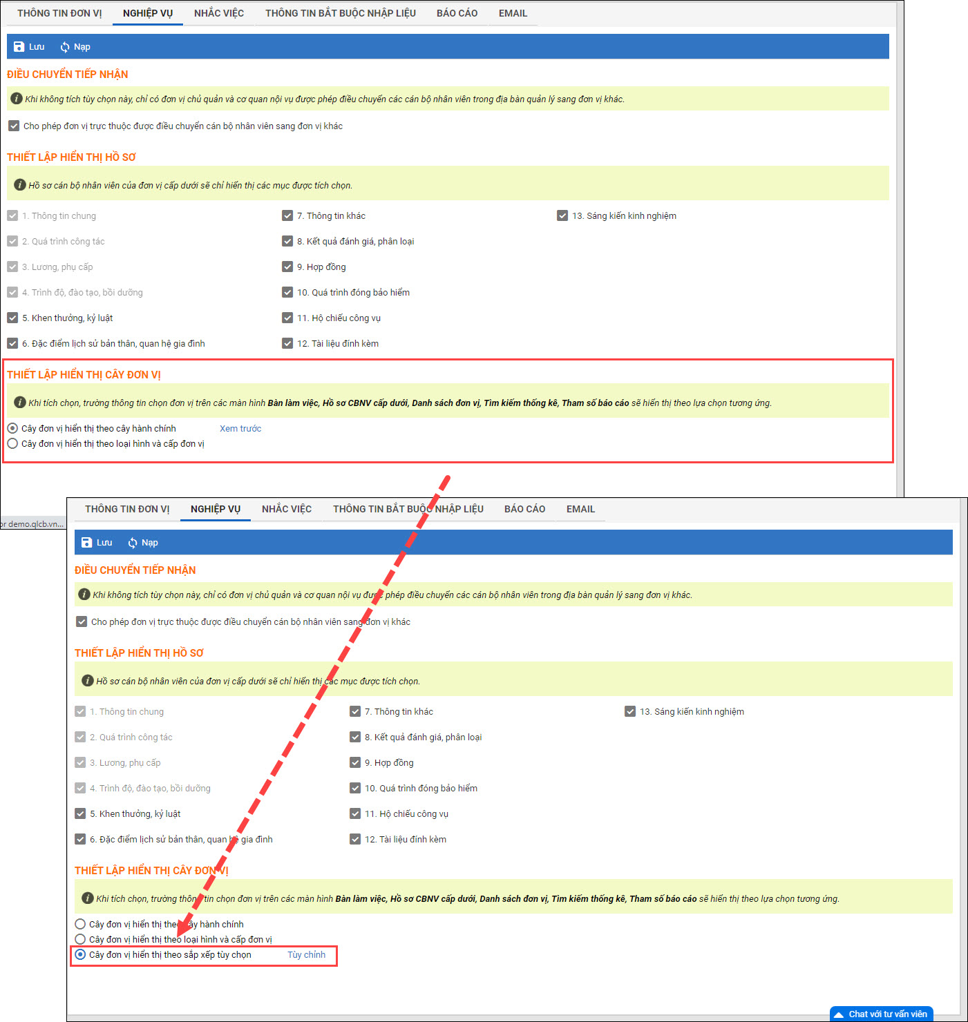 - Hiện tại phần mềm đang đáp ứng 2 cách sắp xếp cây đơn vị: