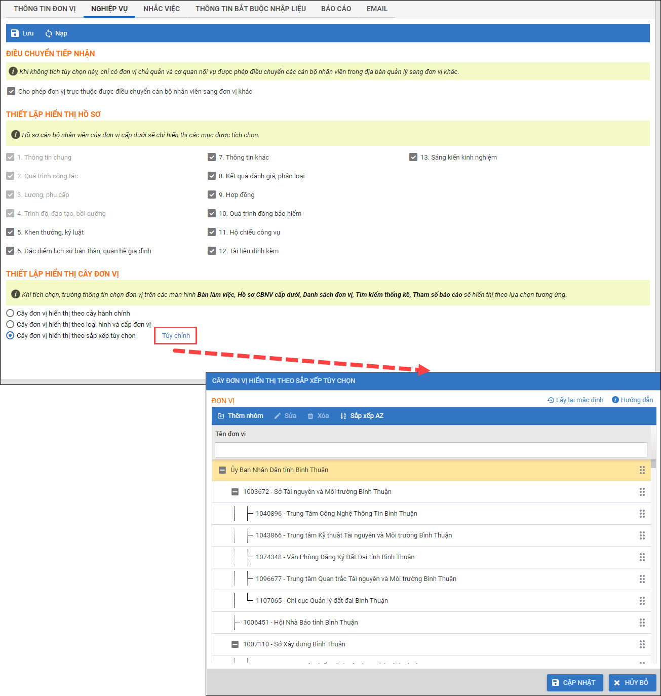 - Tại Hệ thống\Tùy chọn\Nghiệp vụ: Tại phần Thiết lập hiển thị cây đơn vị, thêm mục Cây đơn vị hiển thị theo sắp xếp tùy chọn.