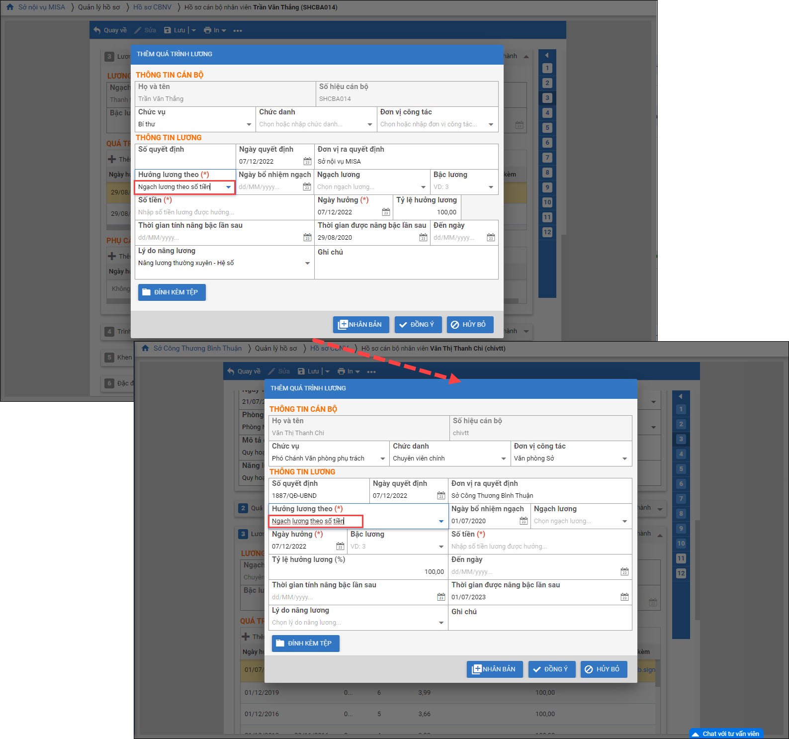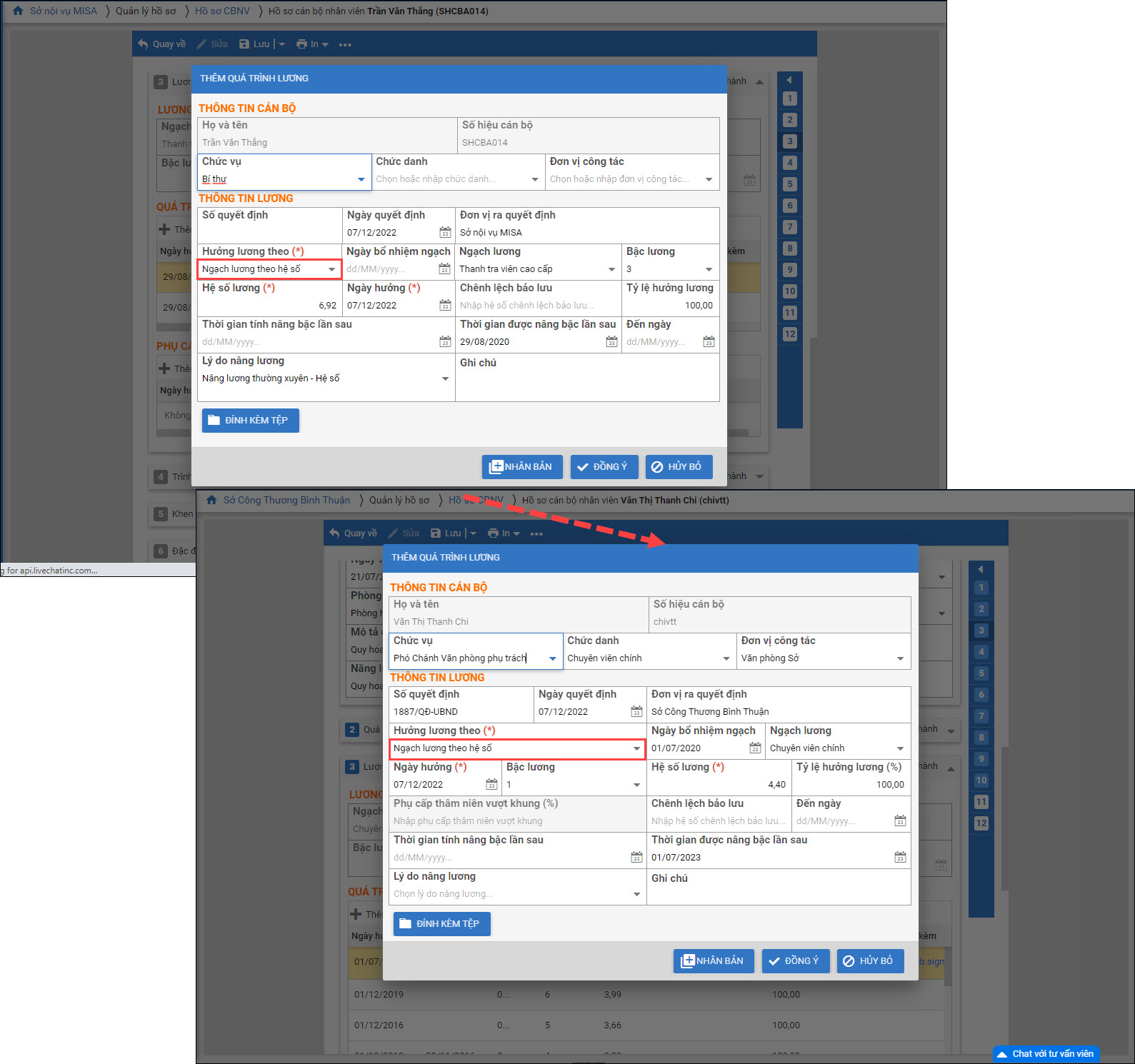 - Tại mục Quản lý hồ sơHồ sơ CBNV, khi Thêm quá trình lương: Sắp xếp thông tin hiển thị như sau: