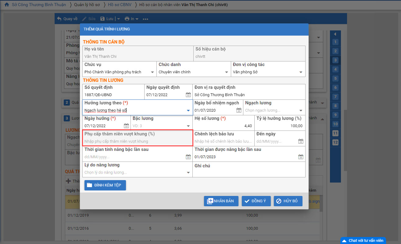 - Đối với Hưởng lương theo Ngạch lương theo hệ số: Bổ sung thông tin Phụ cấp thâm niên vượt khung (%)