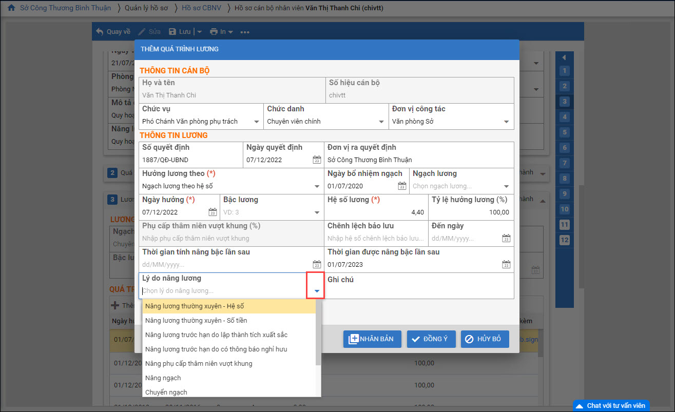 - Thay đổi mục Lý do nâng lương từ nhập nội dung sang chọn trong danh sách: