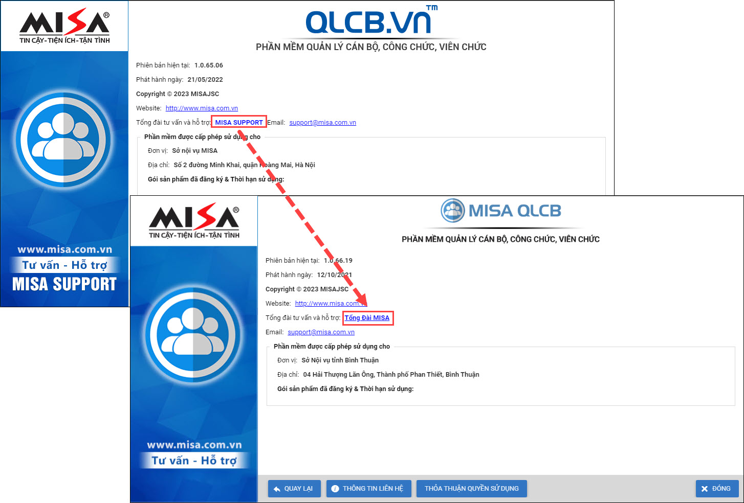 - Trên phần mềm, trong mục Trợ giúp\Giới thiệu: Đang hiển thị “Tổng đài tư vấn và hỗ trợ MISA SUPPORT” và link tới link voip.misa.com.vn