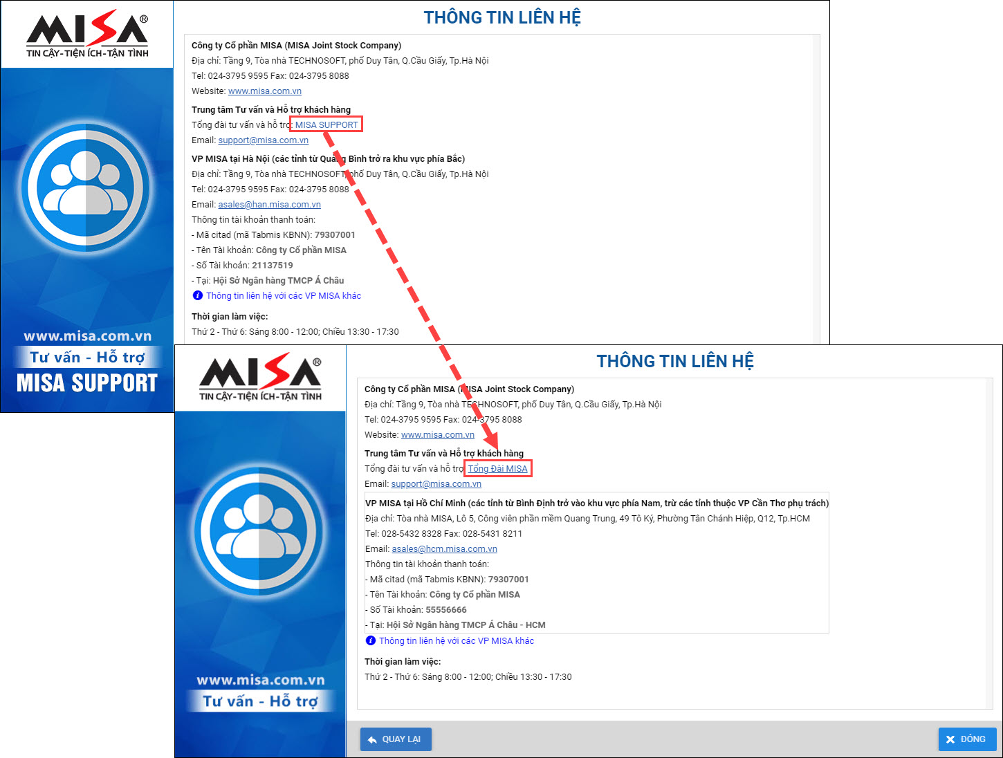 - Trung tâm tư vấn mong muốn kịp thời hỗ trợ khách hàng thông qua “Tổng đài tư vấn hỗ trợ” với link: https://www.misa.vn/tong-dai/