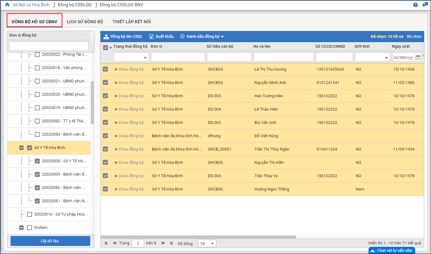 - Đối với chuyên viên có quyền đồng bộ CSDLQG thuộc Sở Nội vụ: