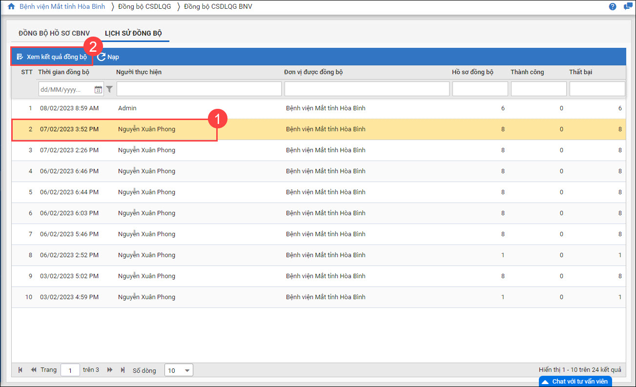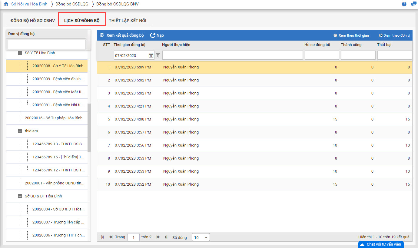 - Theo dõi lịch sử đồng bộ lên CSDLQG của đơn vị mình.