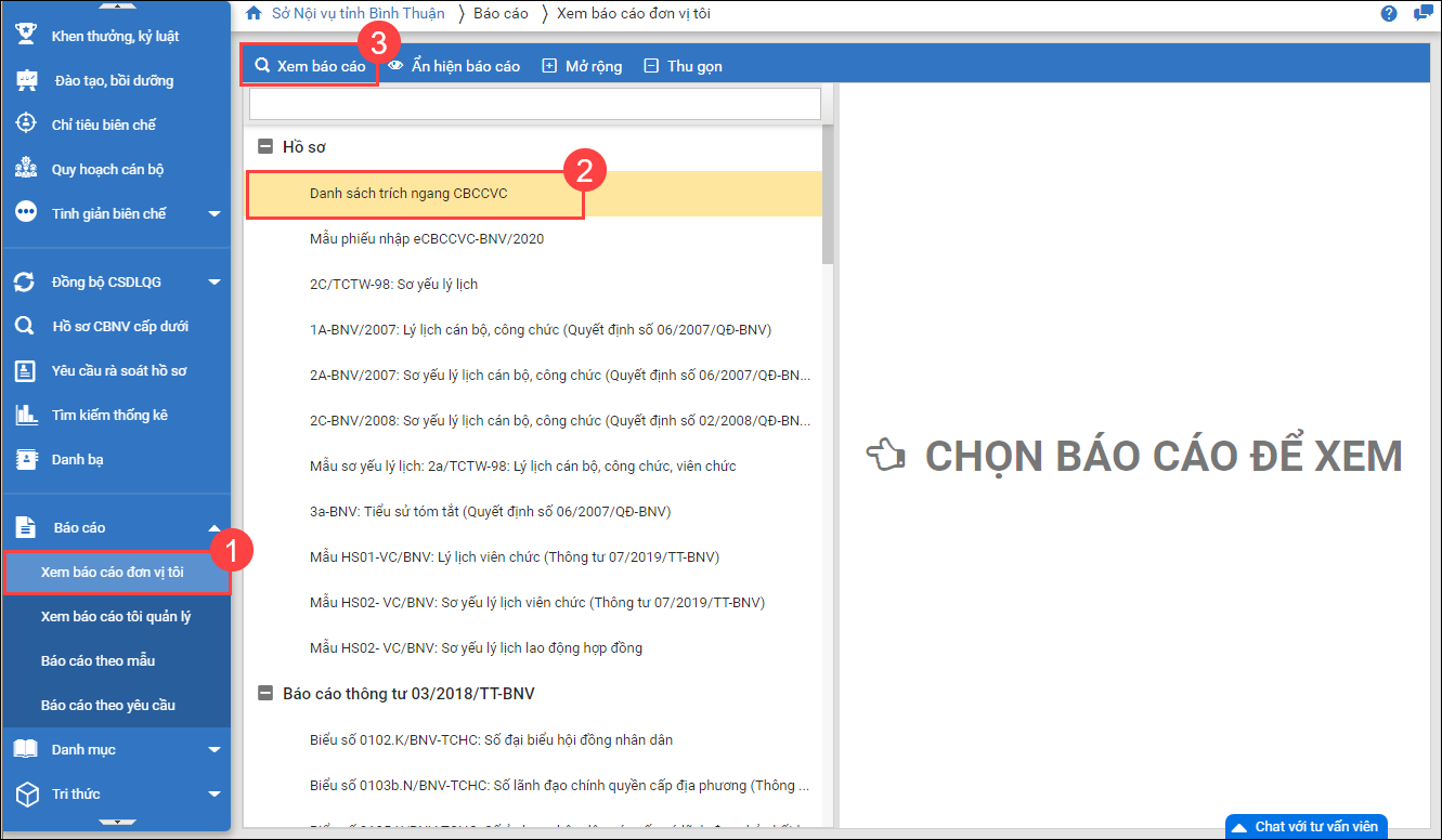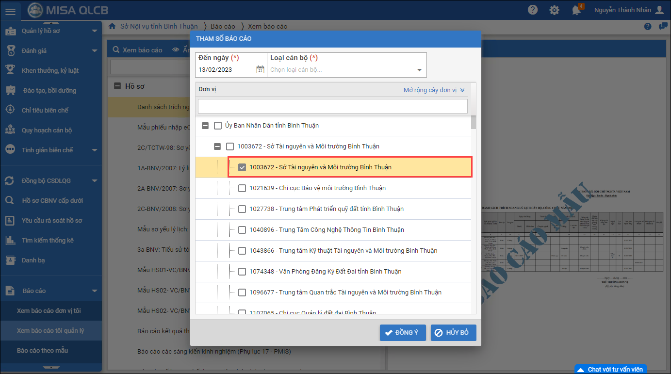 2. Cán bộ tổ chức đơn vị chủ quản/nội vụ muốn in được các báo cáo theo phòng ban tại đơn vị mình