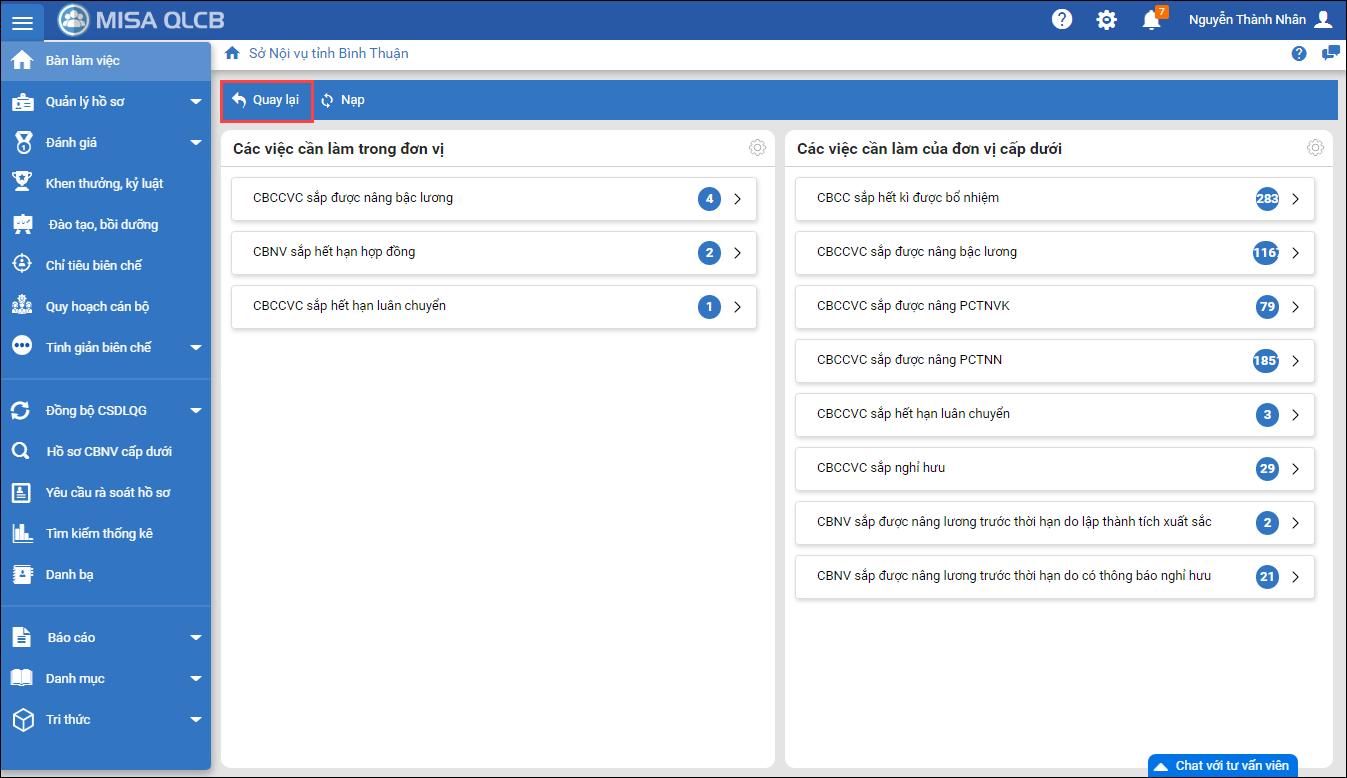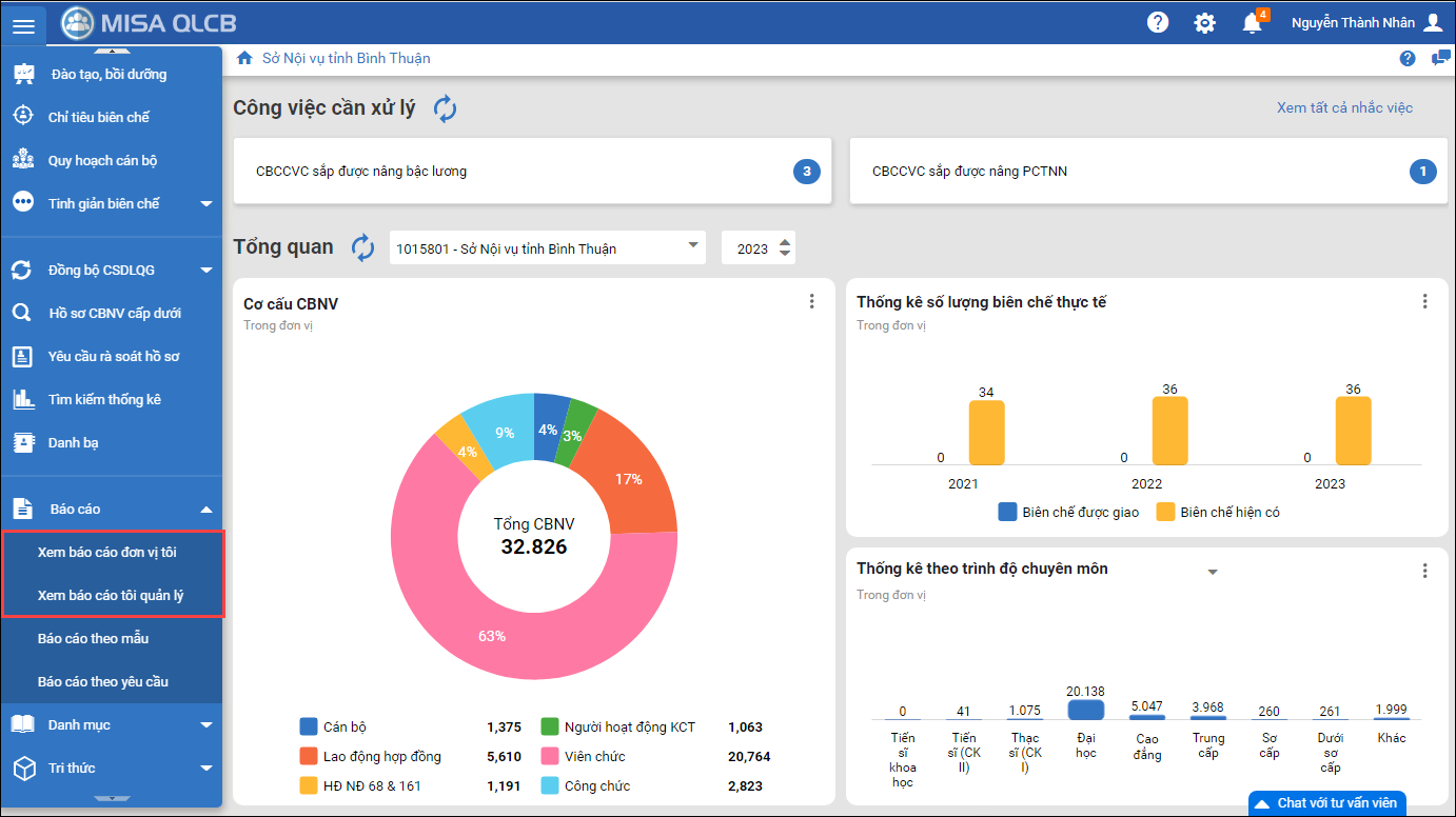 - Tại các đơn vị chủ quản/nội vụ, ngoài nhiệm vụ tổng hợp báo cáo từ các đơn vị cấp dưới, các đơn vị này còn phải quản lý, thống kê, lập báo cáo cho chính các phòng ban trong đơn vị mình.