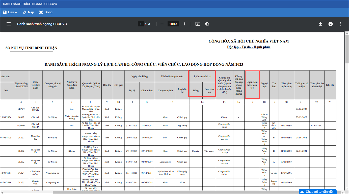 - Cán bộ tổ chức đơn vị có thể theo dõi thông tin Loại đào tạo lý luận chính trị trên danh sách trích ngang CBCCVC.