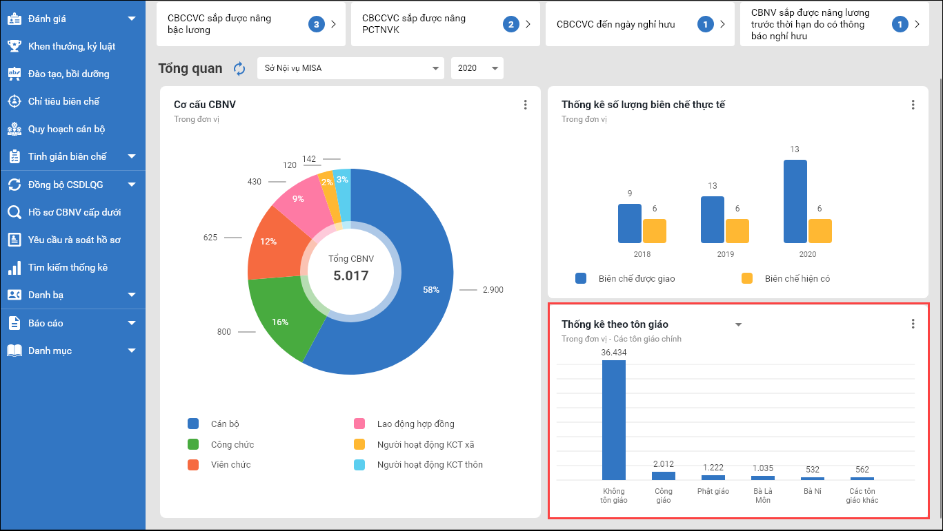 - Hiện trên mục Tổng quan Bàn làm việc phần mềm, chưa thống kê biểu đồ số lượng CBNV tham gia tôn giáo.
