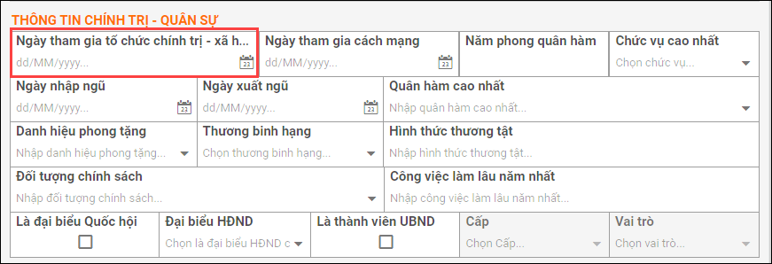 - Mục Thông tin khác\Thông tin chính trị – quân sự: Ngày tham gia tổ chức chính trị – xã hội đầu tiên.