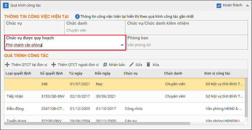 - Mục Quá trình công tác: Chức vụ được quy hoạch.