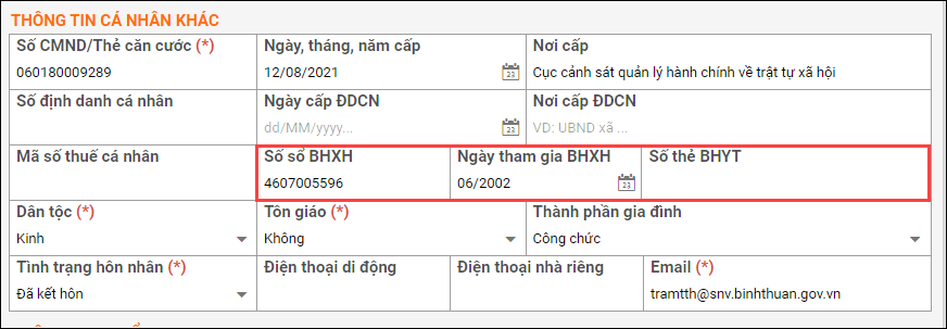 - Bổ sung thông tin Ngày tham gia BHXH và Số thẻ BHYT tại Thông tin chung\Thông tin cá nhân khác.