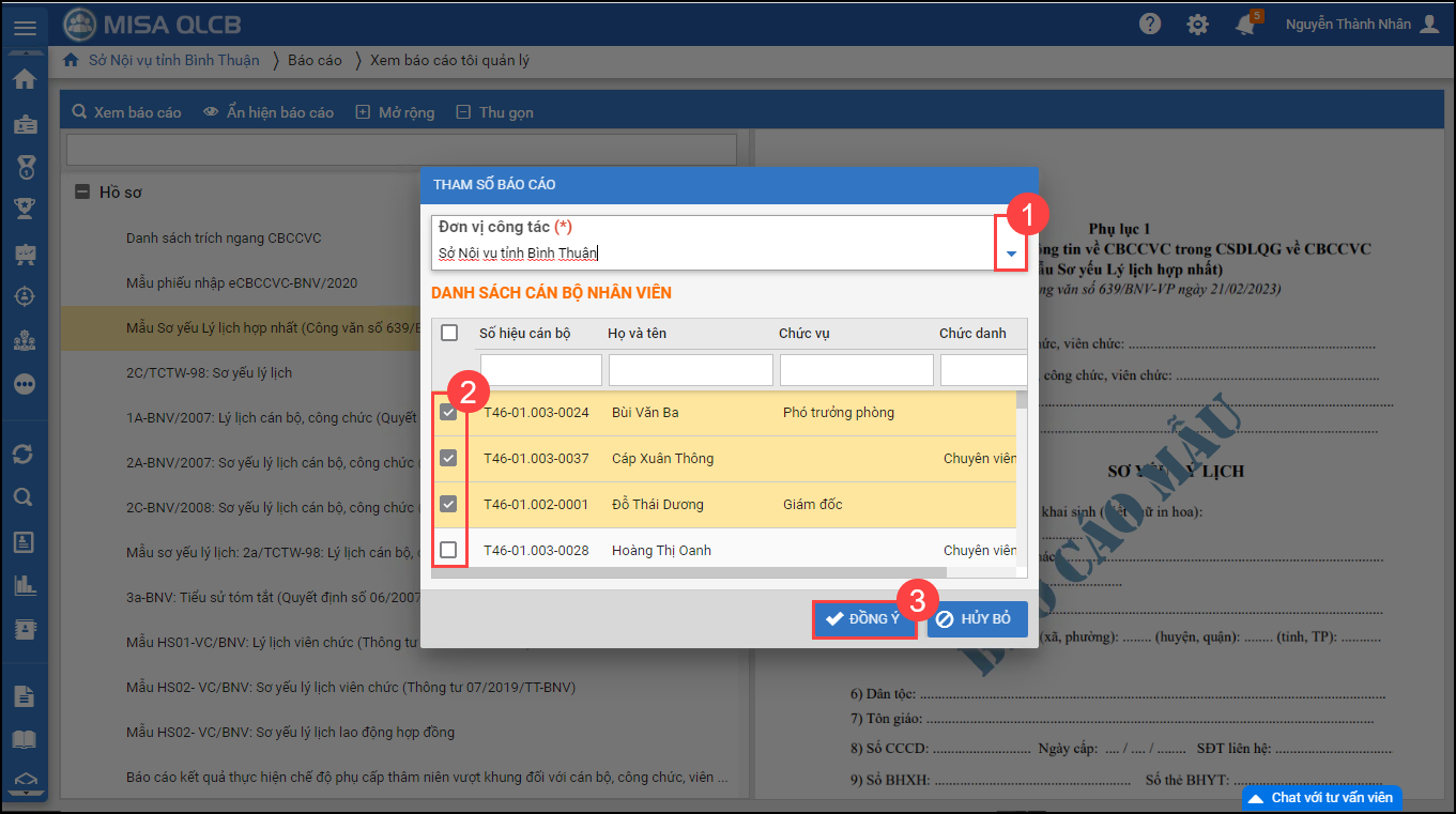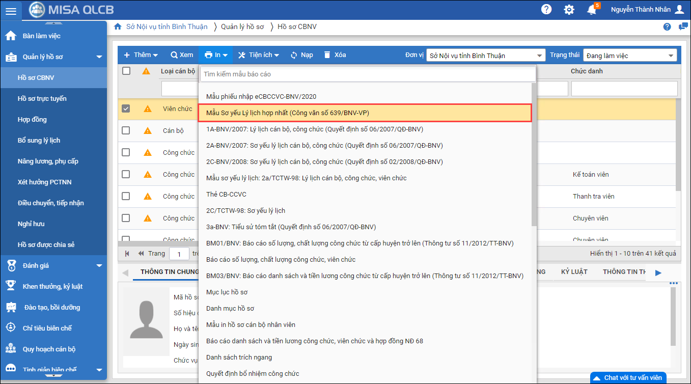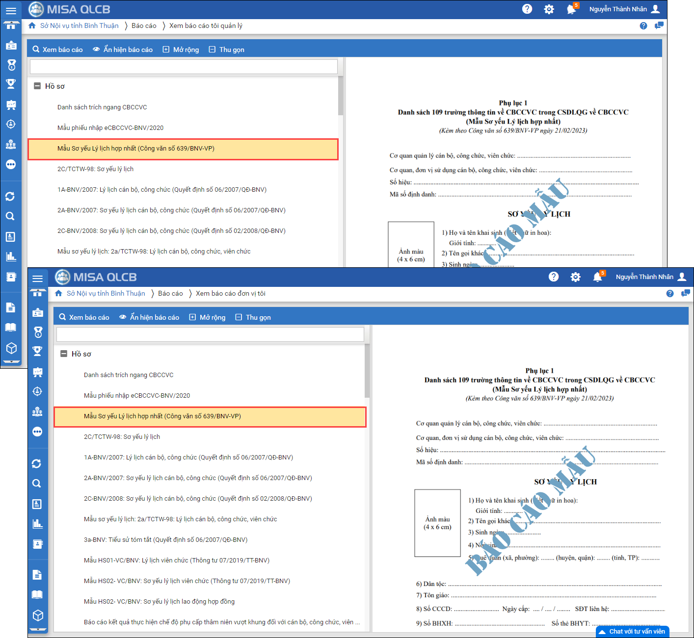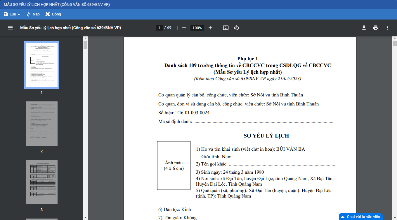 - Phần mềm trả ra mẫu SYLL hợp nhất theo công văn số 639/BNV-VP. Anh/chị có thể tải về máy và in ra để hoàn thiện.