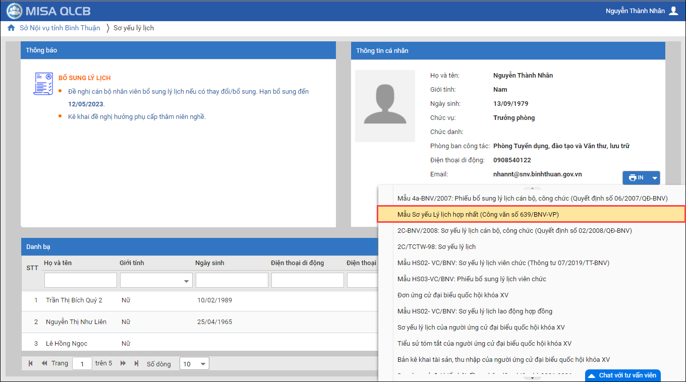 - Cán bộ tổ chức và Cán bộ nhân viên có thể in sơ yếu lý lịch theo mẫu SYLL hợp nhất theo công văn sô 639/BNV-VP ngày 21/02/2023.