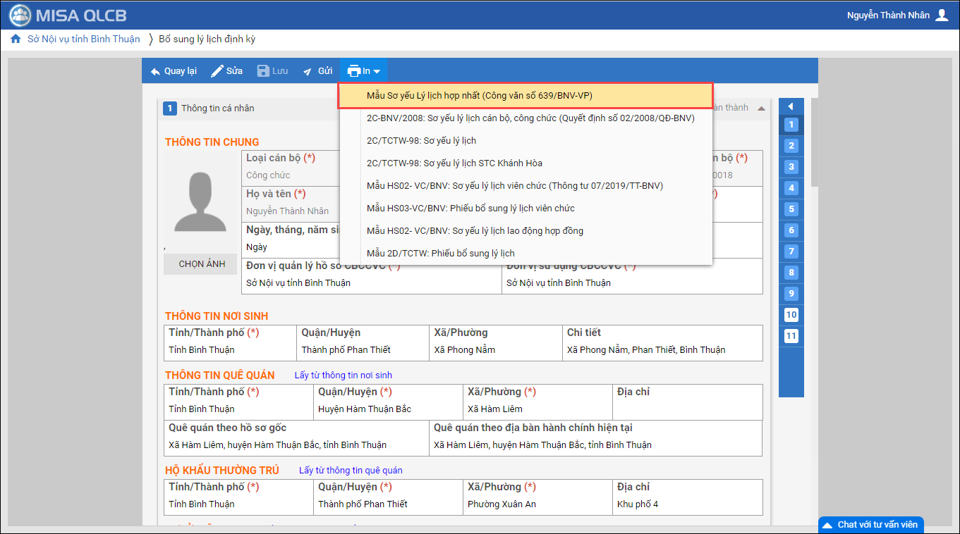 - Trường hợp chưa có đợt Bổ sung lý lịch hoặc có đợt bổ sung nhưng CBNV chưa thực hiện: Sử dụng thông tin do CBTC đã phê duyệt.