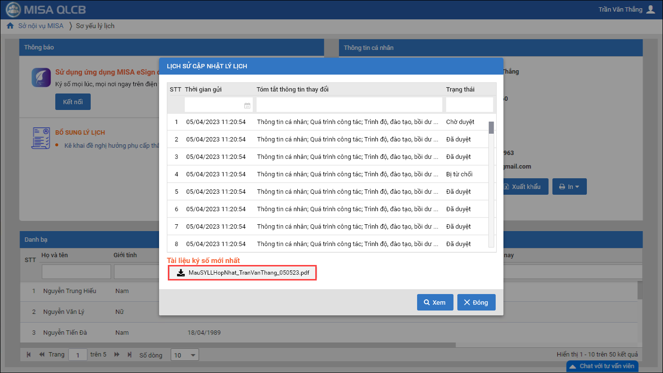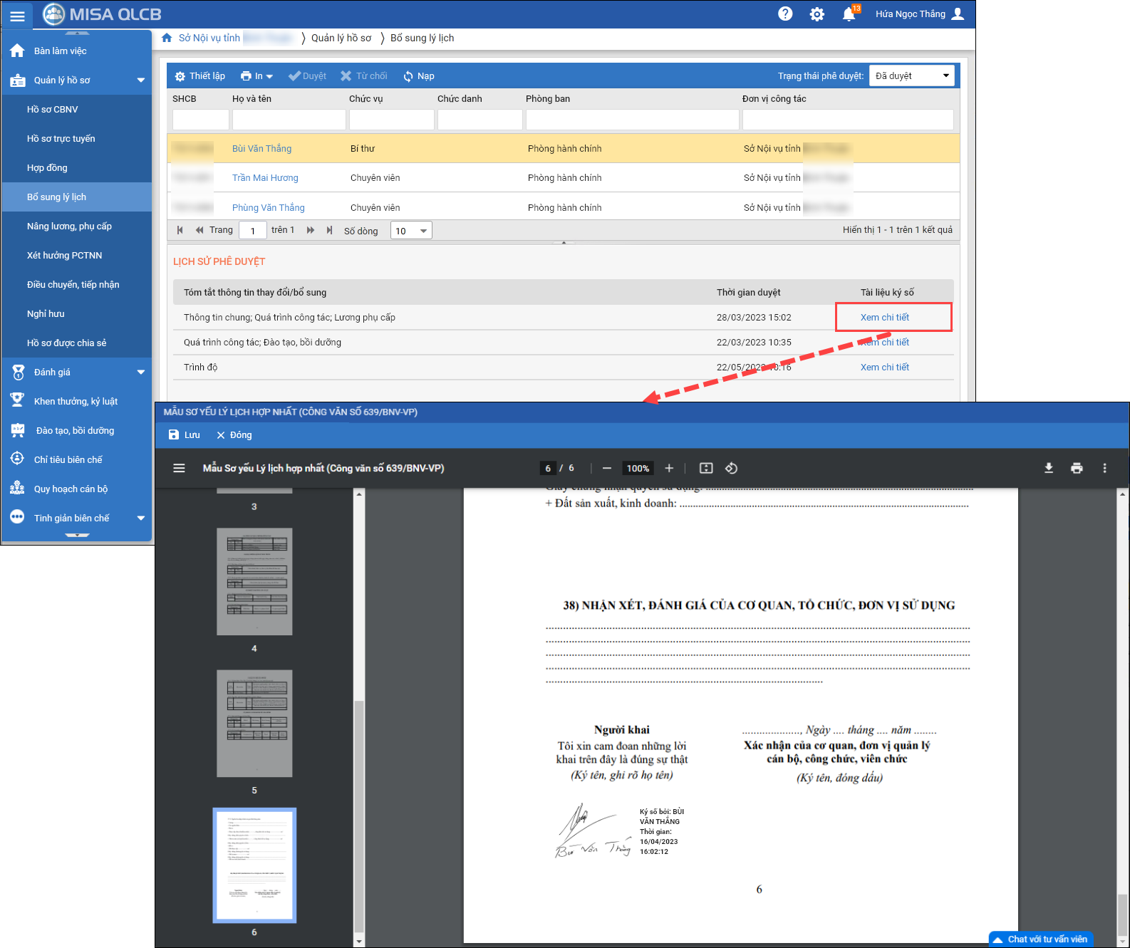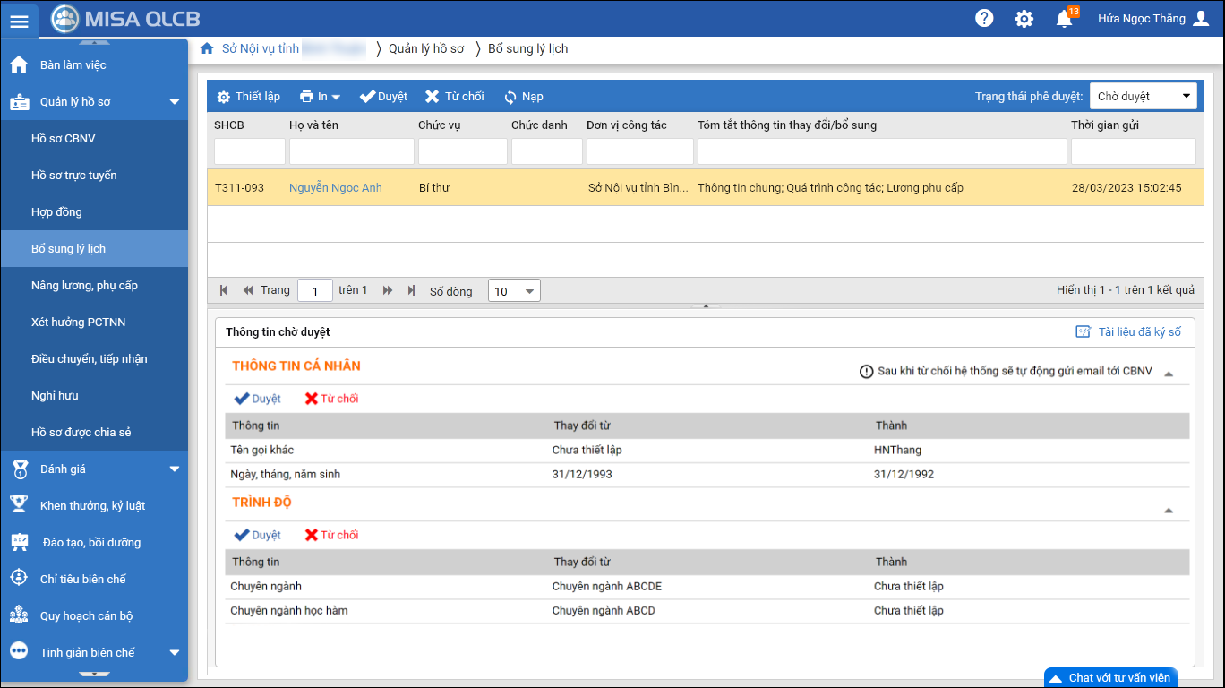 - Tại danh sách Chờ duyệt: CBTC có thể xem được thông tin chi tiết nội dung đã thay đổi/bổ sung và tài liệu CBNV đã ký số (nếu có)