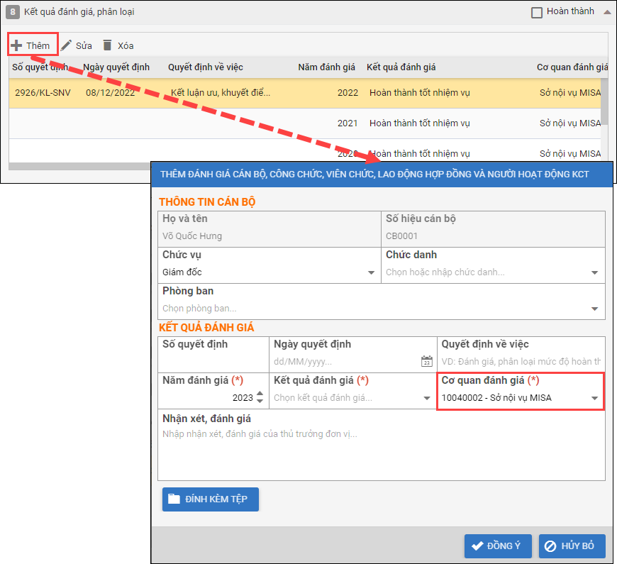 - Thay đổi thông tin Cơ quan đánh giá từ dạng chọn trong danh mục có sẵn sang cho phép chọn hoặc tự nhập.