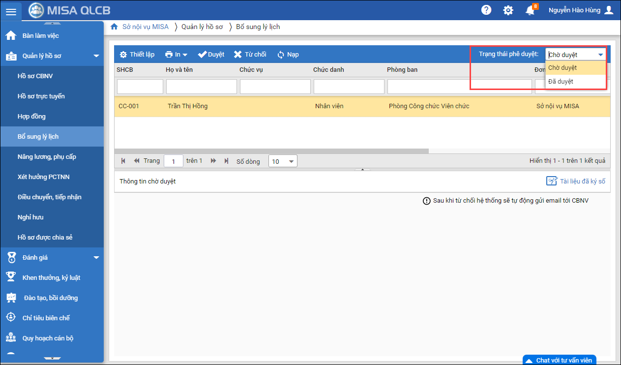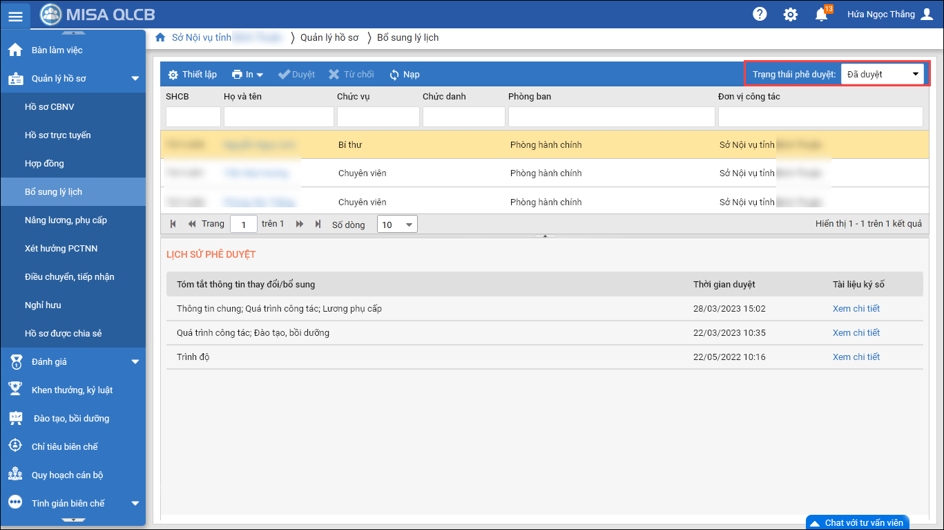 - Tại Quản lý hồ sơ\Bổ sung lý lịch, bổ sung bộ lọc trạng thái phê duyệt: Đã duyệt/Chờ duyệt.