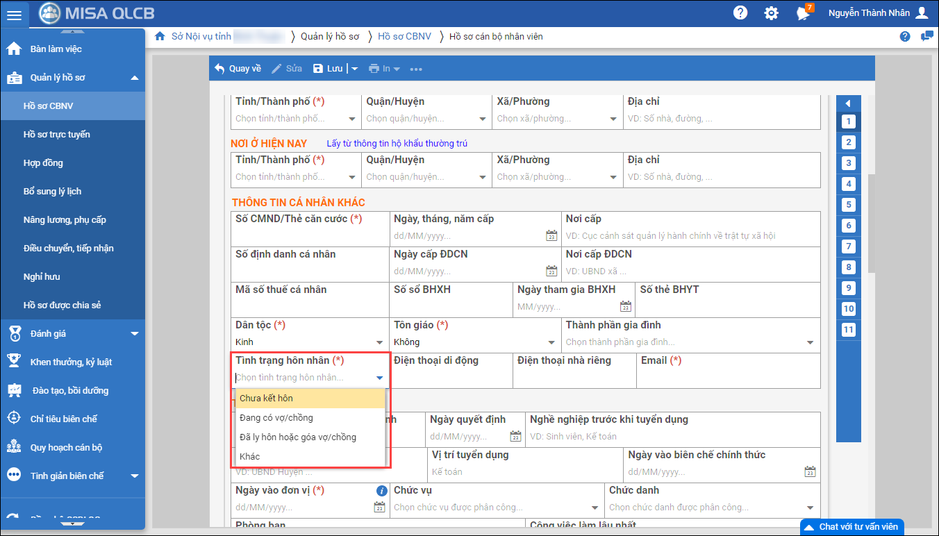 - Tại mục 1. Thông tin cá nhân\Thông tin cá nhân khác, thay đổi giá trị trong danh mục Tình trạng hôn nhân thành:
