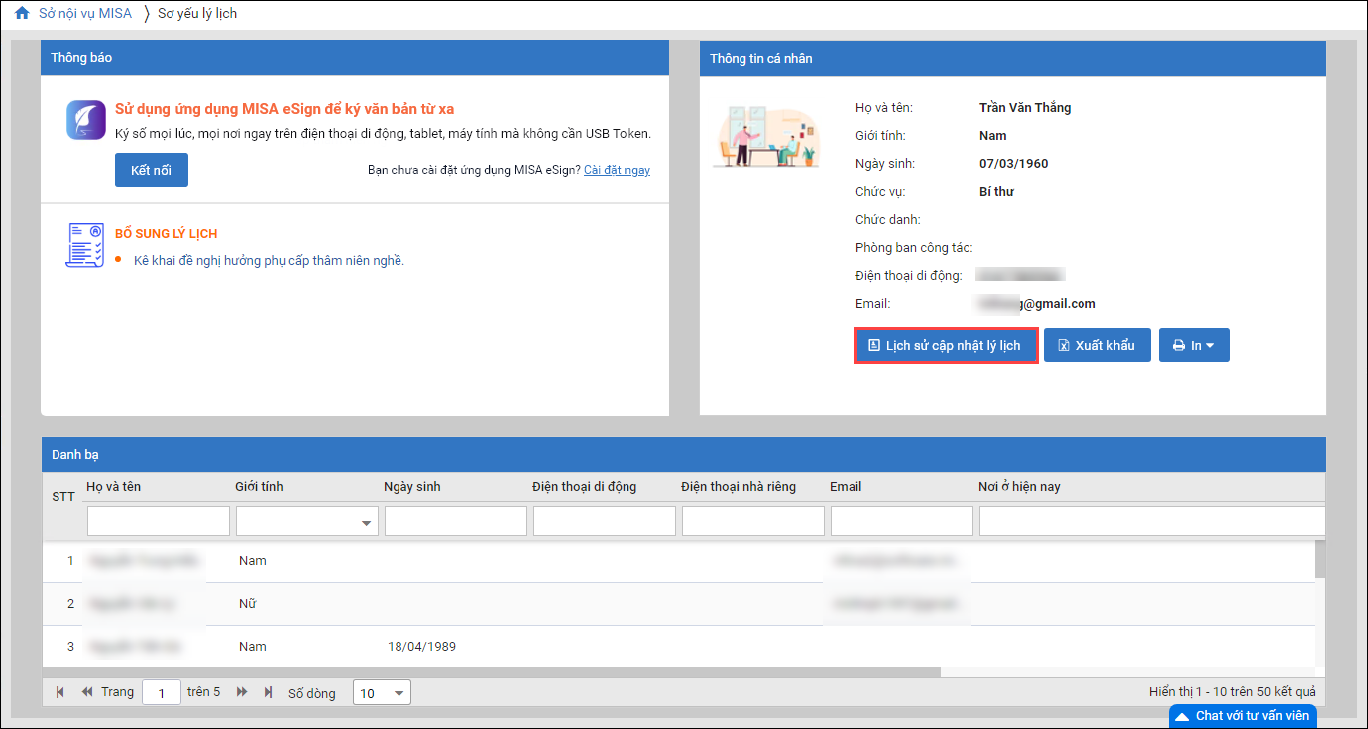 - Tại màn hình chính của CBNV: Bổ sung tính năng Lịch sử cập nhật lý lịch.