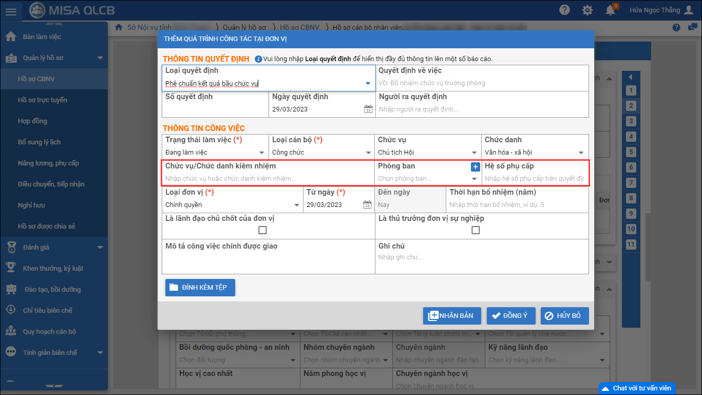 - Không thể thêm được đồng thời 2 bản ghi loại quyết định (Bổ nhiệm và Phê chuẩn chức vụ) có cùng thời gian Từ ngày.