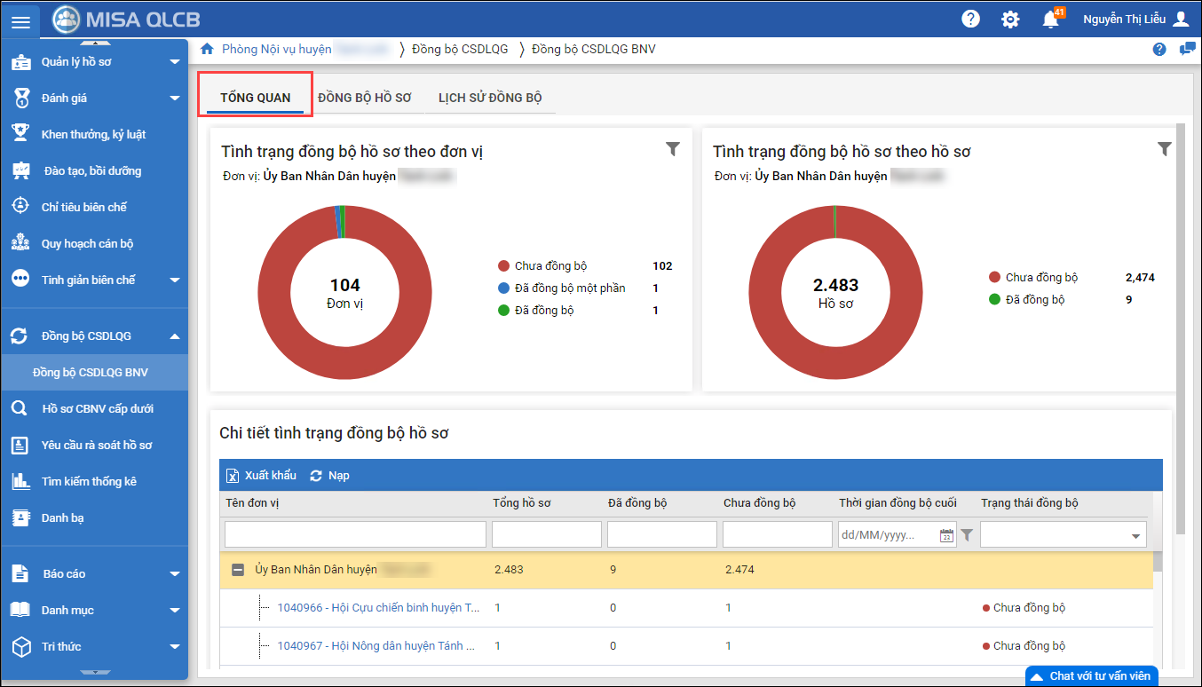 - Tại Đồng bộ CSDLQG\Đồng bộ CSDLQG BNV của đơn vị chủ quản\Phòng Nội vụ, mục Tổng quan: CBTC đơn vị chủ quản/PNV có thể theo dõi được tình hình biến động hồ sơ của toàn đơn vị trực thuộc và đơn vị mình.