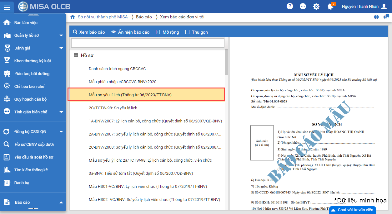 - Với vai trò CBTC đơn vị, tại Báo cáo\Báo cáo đơn vị tôi\Hồ sơ: Tại Mẫu sơ yếu lý lịch hợp nhất: Đổi tên thành Mẫu sơ yếu lý lịch (Thông tư 06/2023/TT-BNV)