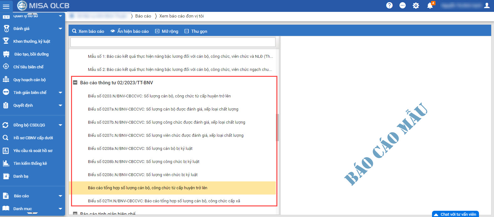 - Tại Báo cáo: bổ sung báo cáo Biểu mẫu 01TH.N/BNV-CBCCVC: Báo cáo tổng hợp số lượng cán bộ, công chức từ cấp huyện trở lên theo TT02/2023/TT-BNV.