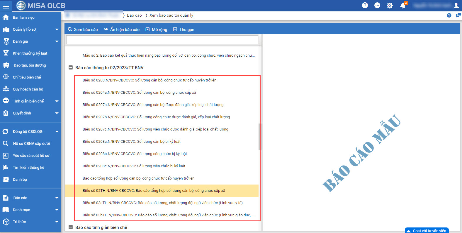 2. CBTC muốn in báo cáo 02TH.N/BNV-CBCCVC: Báo cáo tổng hợp số lượng cán bộ, công chức từ cấp xã theo TT02/2023/TT-BNV