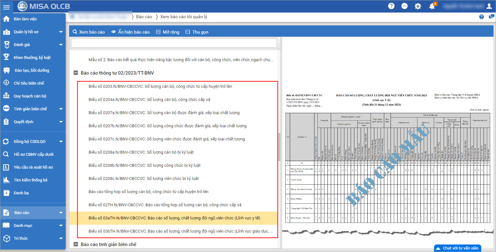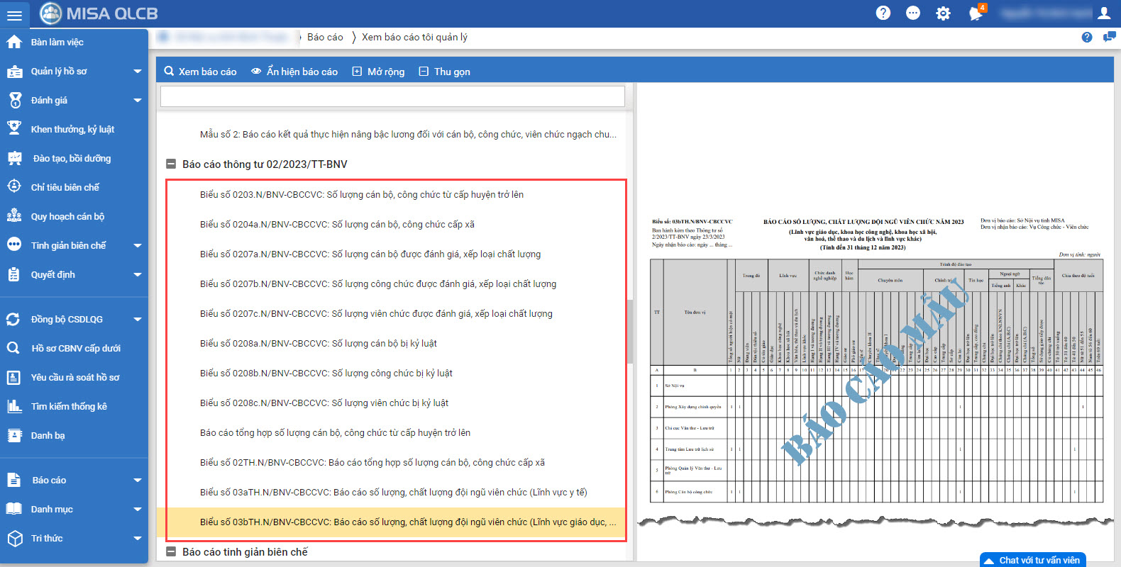 - CBTC có thể in báo cáo 03bTH.N/BNV-CBCCVC: Báo cáo tổng hợp số lượng, chất lượng đội ngũ viên chức (Lĩnh vực giáo dục, khoa học công nghệ, khoa học xã hội, văn hóa, thể thao, du lịch và lĩnh vực khác) theo TT02/2023/TT-BNV.