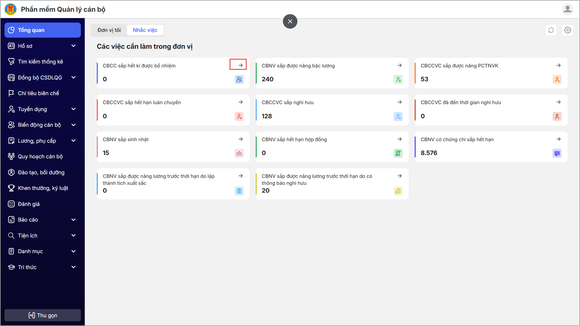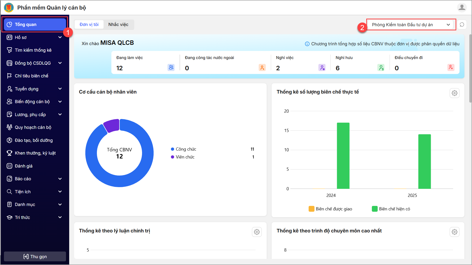 - Sau khi đăng nhập CBTC vào mục Tổng quan, tùy theo vai trò ứng dụng sẽ thống kê các biểu đồ báo cáo tương ứng để anh/chị quản lý số liệu, tình hình hồ sơ CBNV đang quản lý.