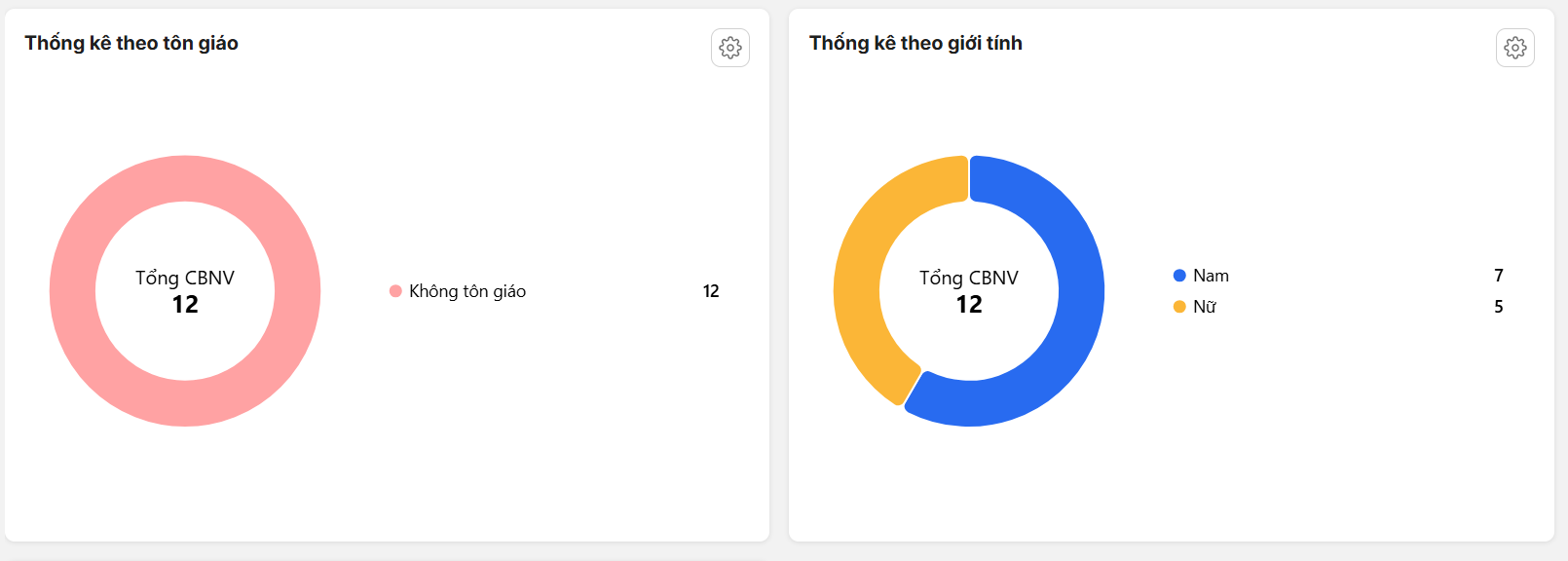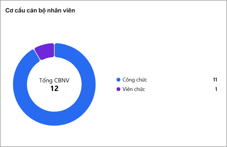 3. Phần mềm hiển thị 1 số báo cáo: Cơ cấu cán bộ nhân viên; Thống kê số lượng biên chế thực tế; Thống kê theo lý luận chính trị; Thống kê theo trình độ chuyên môn cao nhất; Thống kê theo Đảng viên; Thống kê theo dân tộc; Thống kê theo tôn giáo; Thống kê theo giới tính; Thống kê theo độ tuổi
