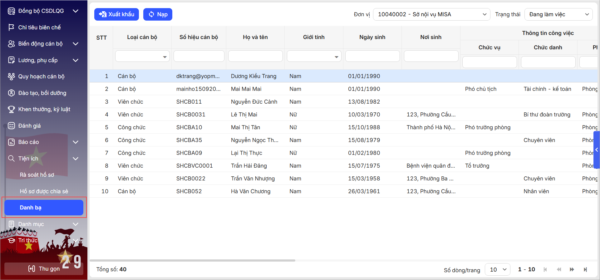 - Anh/chị có thể lọc nhanh các điều kiện tìm kiếm theo Đơn vị, Loại cán bộ, Số hiệu cán bộ, Họ và tên, Giới tính…
