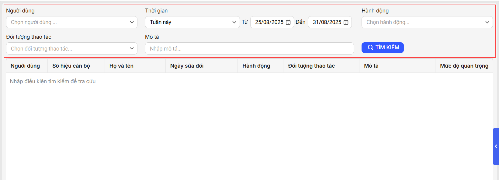 2. Nhập các tiêu chí tìm kiếm, nhấn Tìm kiếmPhần mềm đã lấy lên thông tin truy cập theo các tiêu chí vừa chọn.